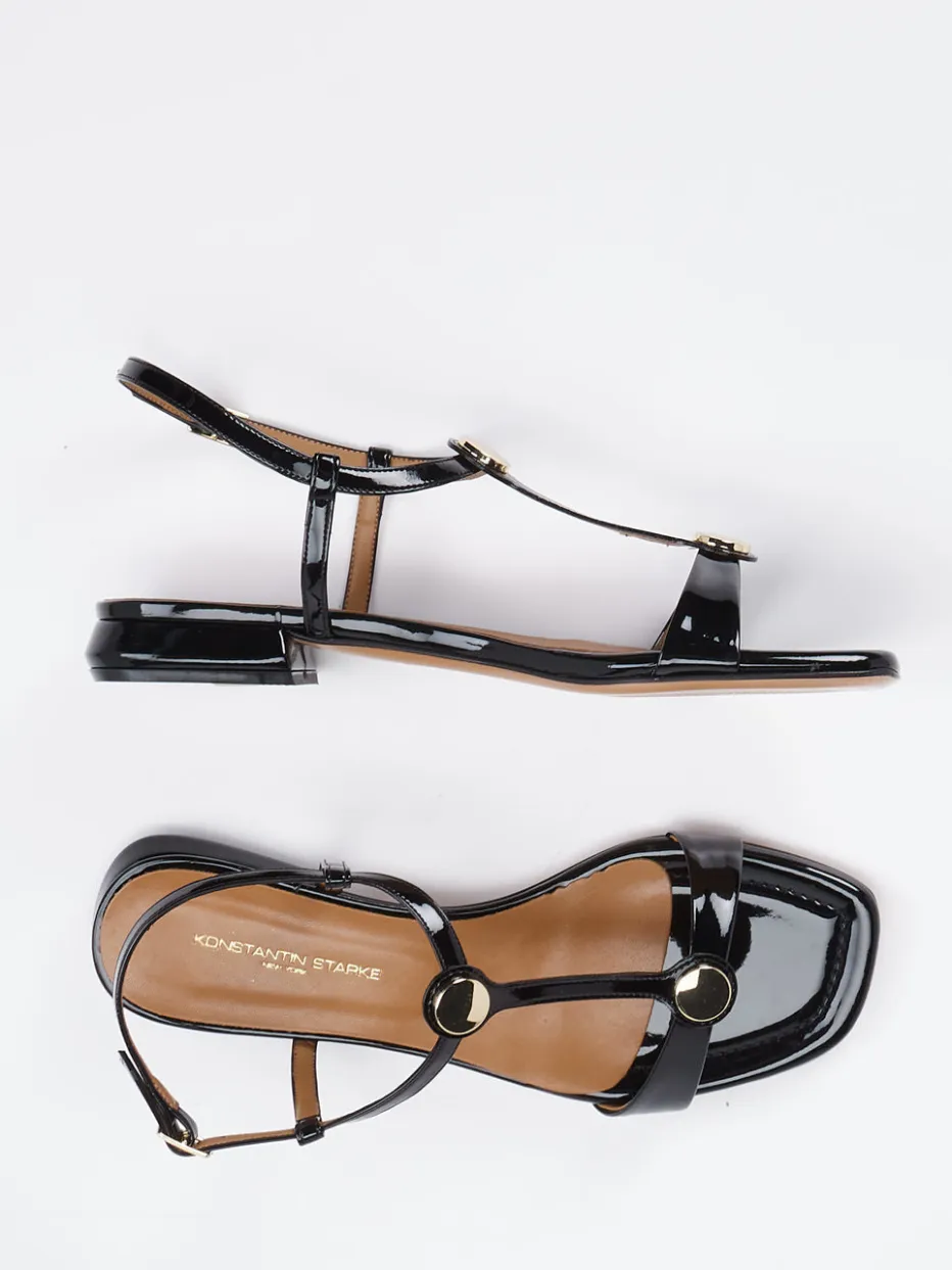 Glanzvolles Statement für Sommerabende.Die Marke Konstantin Starke präsentiert eine exklusive Damen-Sandale im T-Steg-Design. Ideal für besondere Anlässe oder stilvolle City-Looks bietet das schwarze, glänzende Lackleder eine hochklassige Präsenz. Goldfarbene Zierelemente am kunstvoll ausgearbeiteten Mittelsteg setzen edle Akzente, ergänzt durch eine grazile Dornschließe am verstellbaren Fersenriemen. Die offene Silhouette mit flachem Blockabsatz verbindet Komfort mit moderner Eleganz. Im Trend verankert durch „Metallic Accents“ und „Quiet Luxury“, lässt sich dieses Modell hervorragend mit einer schwarzen Clutch und Goldschmuck kombinieren. Feine Passform trifft auf minimalistisch luxuriöse Ästhetik.