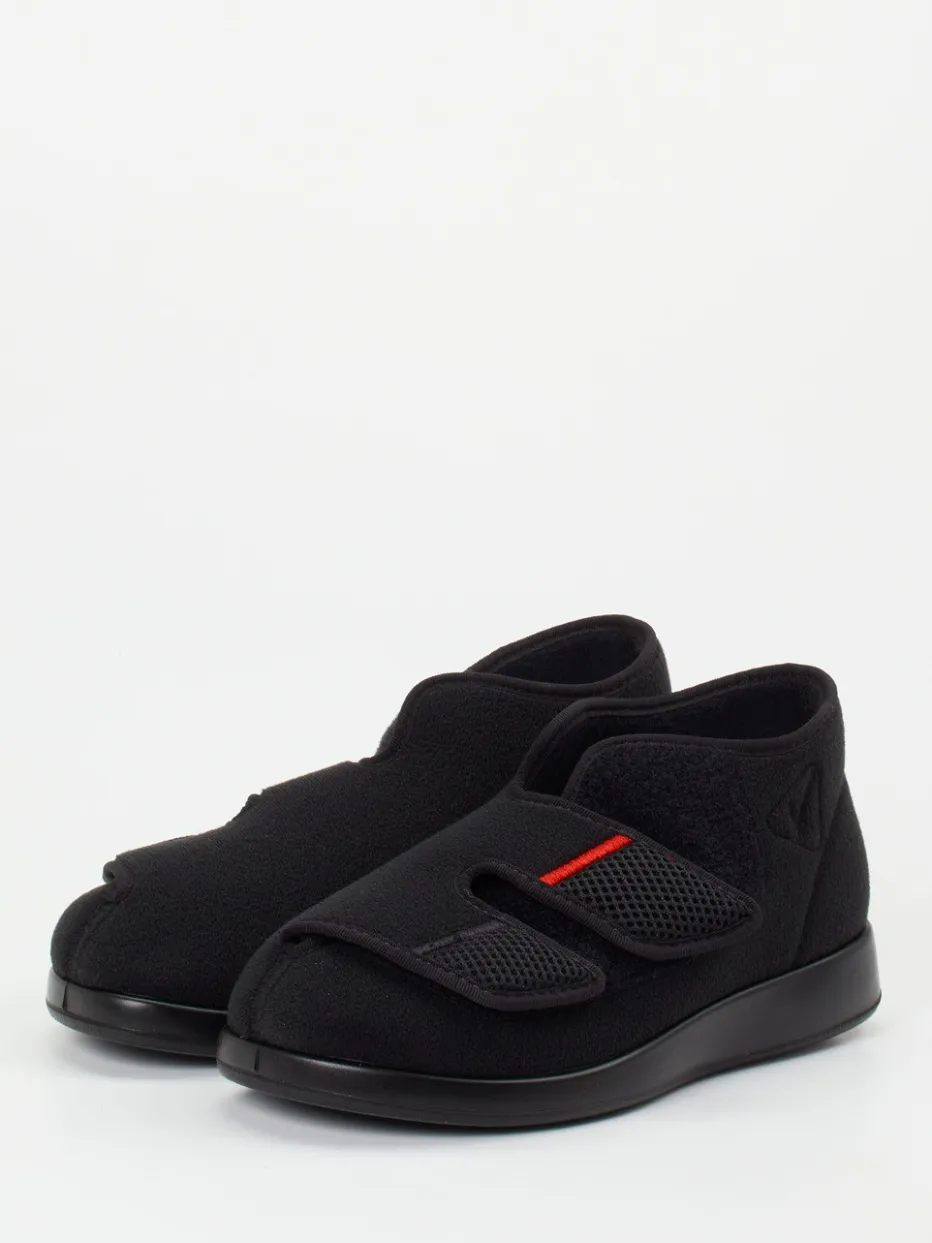 Stabilität trifft Komfort.Varomed präsentiert mit diesem Therapieschuh eine funktionale Lösung für entspannte Momente zuhause oder unterwegs. Das Modell aus schwarzem Textil mit weich anmutender Oberfläche überzeugt durch ergonomische Passform, eine knöchelhohe, geschlossene Form und praktische Klettverschlüsse für leichtes An- und Ausziehen. Ein roter Akzent auf dem Verschluss verleiht dem minimalistischen Design eine dezente Note. Die profilierte Gummisohle bietet Trittsicherheit auf verschiedenen Untergründen. Inspiriert vom Trend „Comfort Core“ richtet sich der Schuh an Komfortliebhaberinnen mit Sinn für zurückhaltende Ästhetik. Varomed steht für funktionale Wohlfühlschuhe mit durchdachtem Detailanspruch.