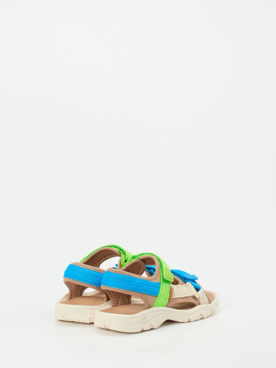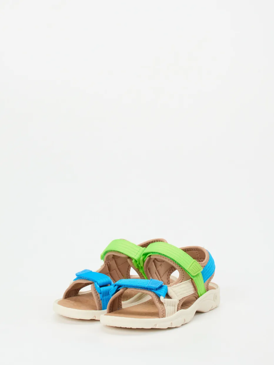 Ideal für aktive Sommertage bietet das Modell verstellbare Klettverschlüsse, die das An- und Ausziehen erleichtern und eine individuelle Passform ermöglichen. Der bequeme Textilschaft in Beige wird durch fröhlich kontrastierende Riemen in Himmelblau, Neongrün und Weiß ergänzt. Die ergonomisch geformte und gepolsterte Innensohle sowie eine strukturierte, rutschfeste Gummilaufsohle bieten optimale Trittsicherheit. Durch die offene, luftige Silhouette eignet sich die Sandale perfekt für Freizeit, Spielen im Freien oder kleine Wanderungen. Lässig kombinierbar mit Shorts und UV-Shirt.