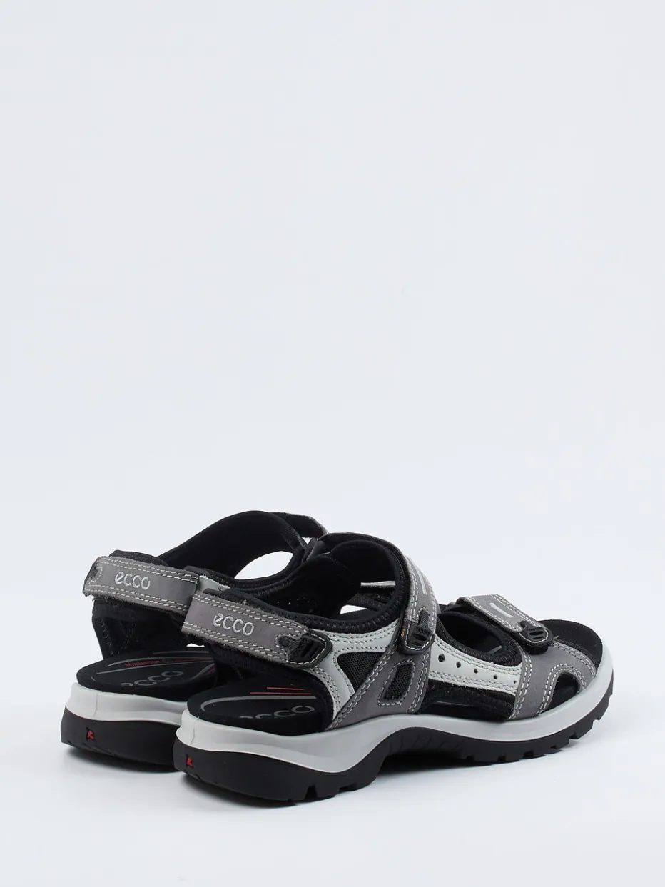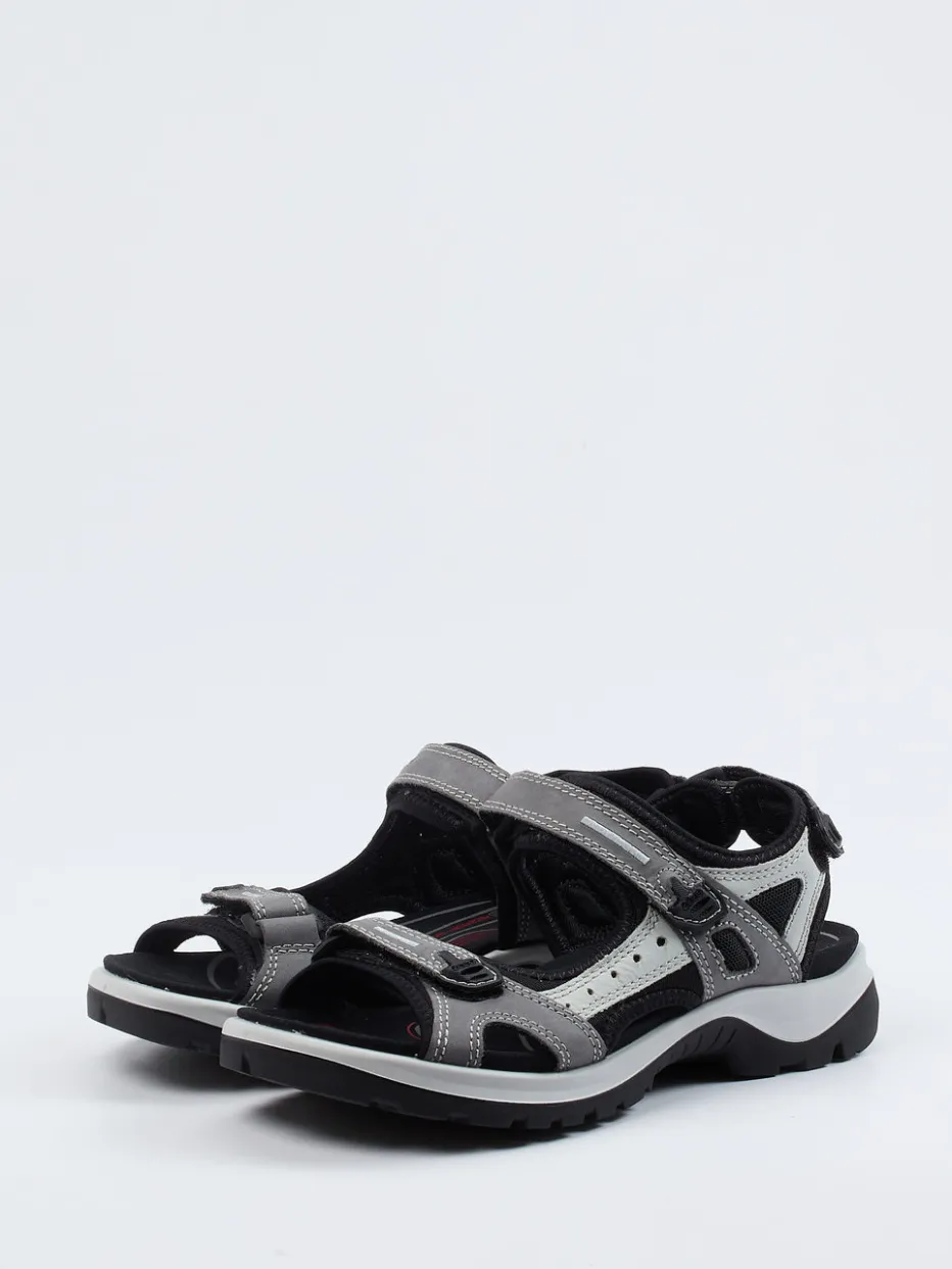 Im sportlichen Design begeistert diese strapazierfähige Trekking-Sandale von der Marke Ecco mit ihren komfortablen Eigenschaften. Das stein- und hellgraue Nubukleder bekommt durch die hellen Nähte auf den Riemchen Struktur und ist mit angenehm softem Textil in Schwarz unterlegt. Die drei Klettverschlüsse ermöglichen eine ideale Passform und geben besonders guten Halt. Bequem zeigt sich die markant profilierte, flexible Gummisohle.
