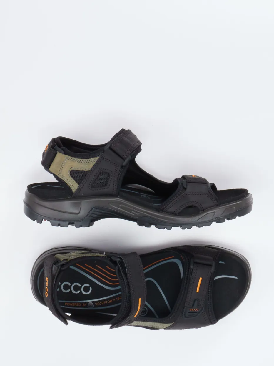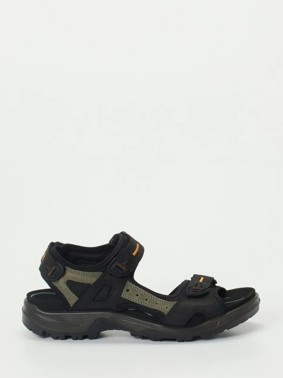 Performance trifft Komfort in der Natur.Ecco präsentiert mit dieser Trekking-Sandale für Herren ein funktionales Modell für aktive Tage. Ideal für Wanderungen bei warmem Wetter bietet die offene, ergonomisch geformte Silhouette mit drei Klettverschlüssen individuellen Halt. Das Material aus Textil zeigt sich in mattem Schwarz mit olivgrünen Elementen, ergänzt durch atmungsaktive Mesh-Einsätze und ein weiches Neoprenfutter. Orangefarbene Kontrastdetails und Logo-Prints setzen sportliche Akzente im Gorpcore-Stil. Die rutschhemmende Gummisohle mit markanter Profilierung sorgt für Trittsicherheit. Lässt sich ideal mit Funktionsshorts und Outdoor-Rucksack kombinieren. Höchster Gehkomfort durch Receptor®-Technologie und markentypisches Designverständnis.