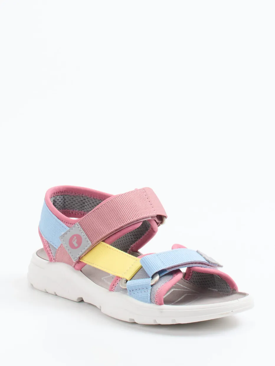Pastell trifft Funktionalität.Ricosta zeigt mit dieser Trekkingsandale für Kinder eine farbenfrohe Interpretation des funktionalen Gorpcore-Stils. Ob beim Spielen im Garten oder auf kleinen Wandertouren – die offene Sandale bietet sicheren Sitz durch verstellbare Klettverschlüsse und ein bequemes Fußbett. Das Obermaterial aus Textil und Mesh erscheint in trendigem Altrosa, ergänzt von hellblauen und pastellgelben Akzenten. Die breite PU-Sohle ist robust sowie rutschhemmend und unterstützt bei jedem Schritt. Ein reflektierendes Logo sorgt dabei für Sichtbarkeit. Besonders gut kombinierbar mit leichten Outdoor-Jacken oder kindgerechten Rucksäcken. Verbindet farbenfrohes Design mit funktionalem Sommerkomfort für aktive Kids.