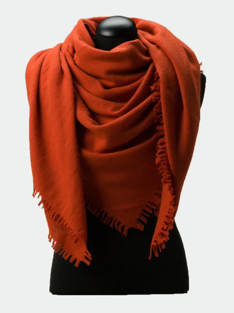 Der hochwertige Materialmix aus Lanawolle und Kaschmir sorgt für spürbaren Tragekomfort. Die dreieckige Form mit Fransen und das warme Ziegelrot machen es zum idealen Herbstaccessoire.