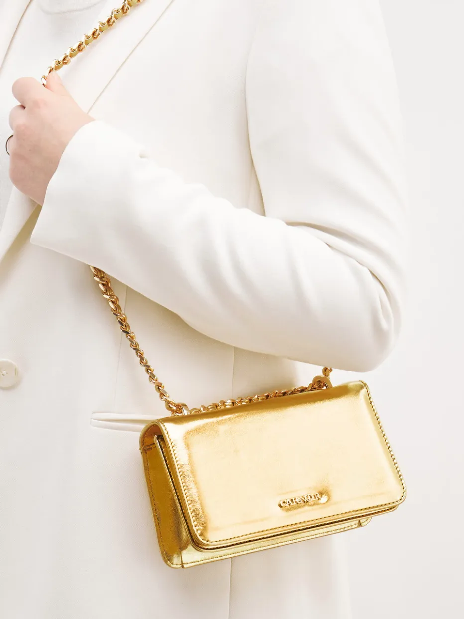 Diese CAFèNOIR Schultertasche überzeugt mit glänzendem Metallicleder sowie einer edlen Kettengurt-Optik – ein stilbewusstes Highlight für besondere Anlässe.