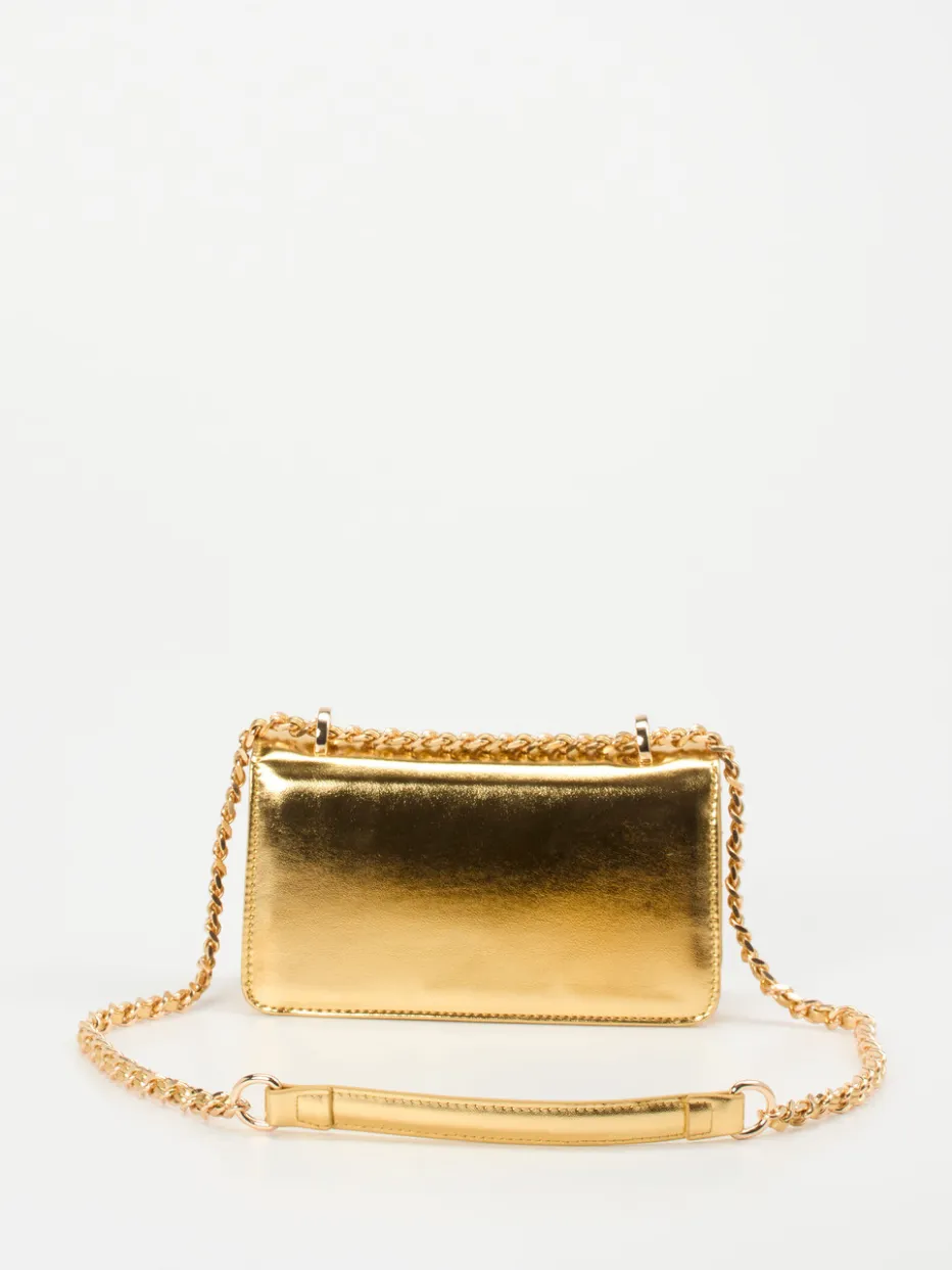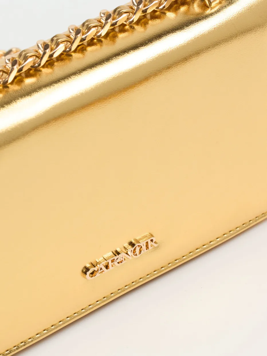 Glänzt, damit Sie glänzen können: diese praktische Minitasche der Marke CaféNoir besticht mit ihrem hochwertigen Metallicleder, das durch seine goldene Farbgebung jedem Outfit den letzten Schliff verleiht. Egal ob klassische Abendgarderobe oder lässiger Party-Look, das puristische, rechteckige Design, das auf jeden überflüssigen Akzent verzichtet, passt einfach immer. Besonders hübsch ist der filigrane Schultergurt, der mit seiner ineinander verschlungenen Kombination aus Kettchen und Lederriemchen zu punkten weiß. Im geräumigen Inneren sorgen im Scheckkartenformat gehaltene Steckfächer für Ordnung und einen schnellen Zugriff auf alle wichtigen Dokumente. – Obermaterial: Metallicleder – Futter: Textil – Farbe: goldfarben – Größe: ca. 10 x 20 x 5 cm (H x B x T) – Schulterriemen: ca. 90 cm – Verschluss: Druckknopf – Innen: vier Steckfächer