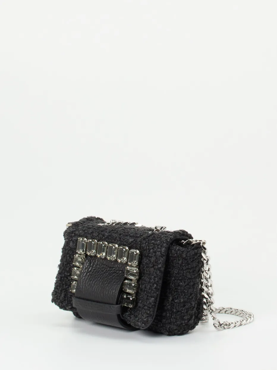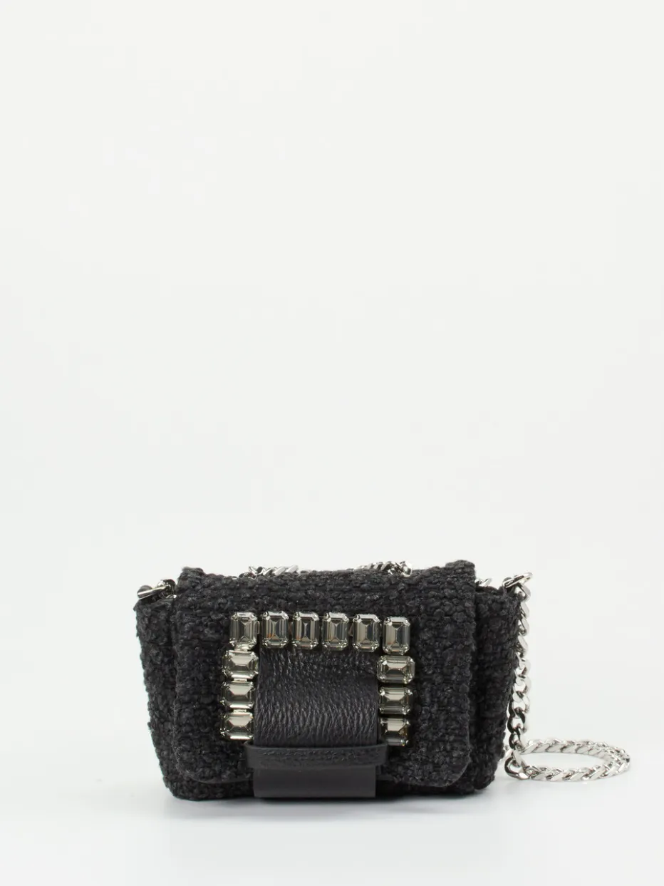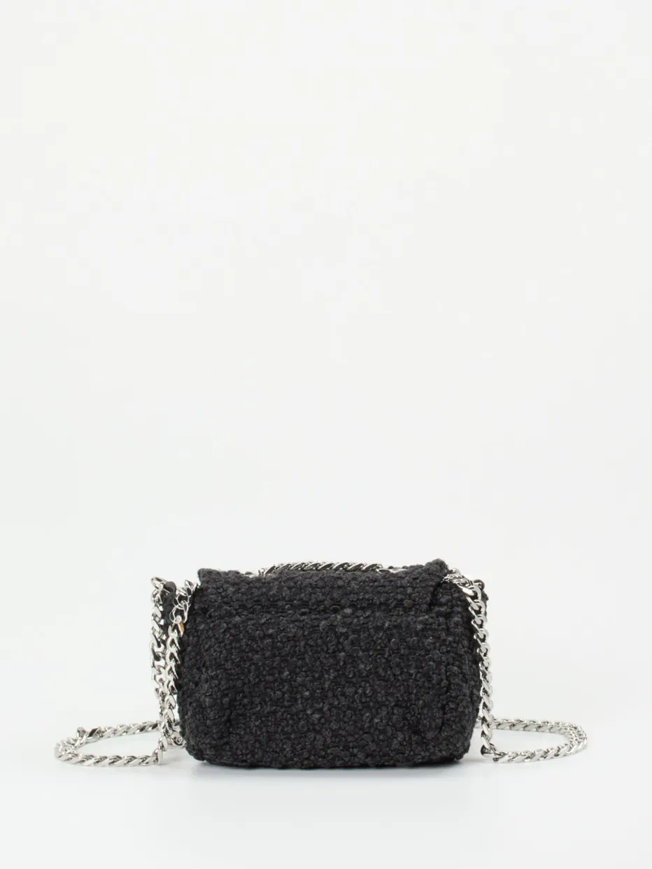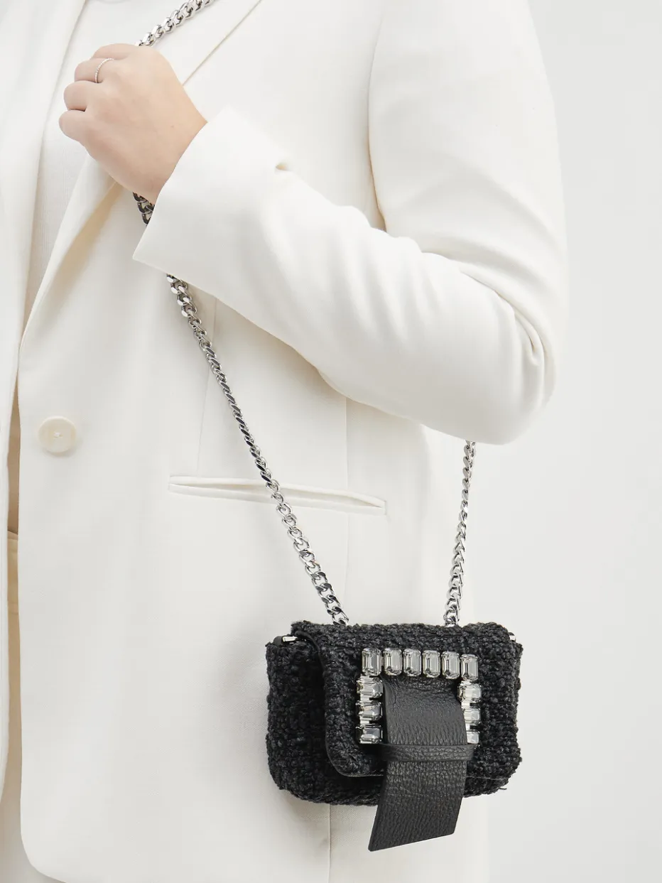Fein strukturierter Bouclé aus Astrachan verleiht dieser Mini Bag von Konstantin Starke ihre edle Haptik. Schmucksteinakzente und silberner Kettenriemen sorgen für modischen Glamour.