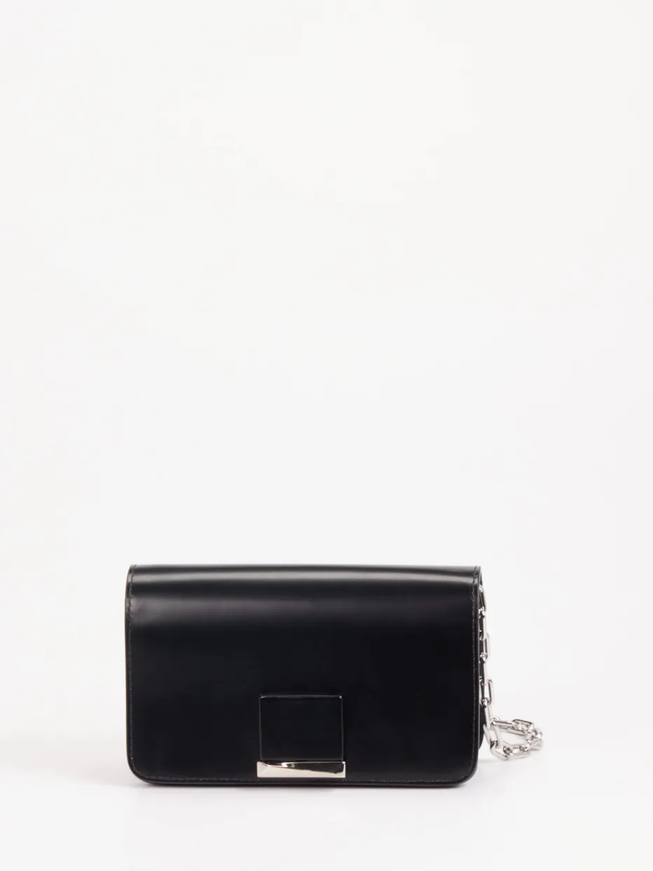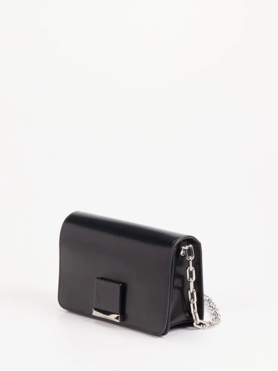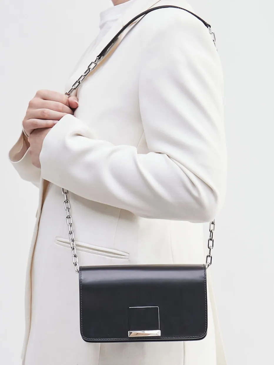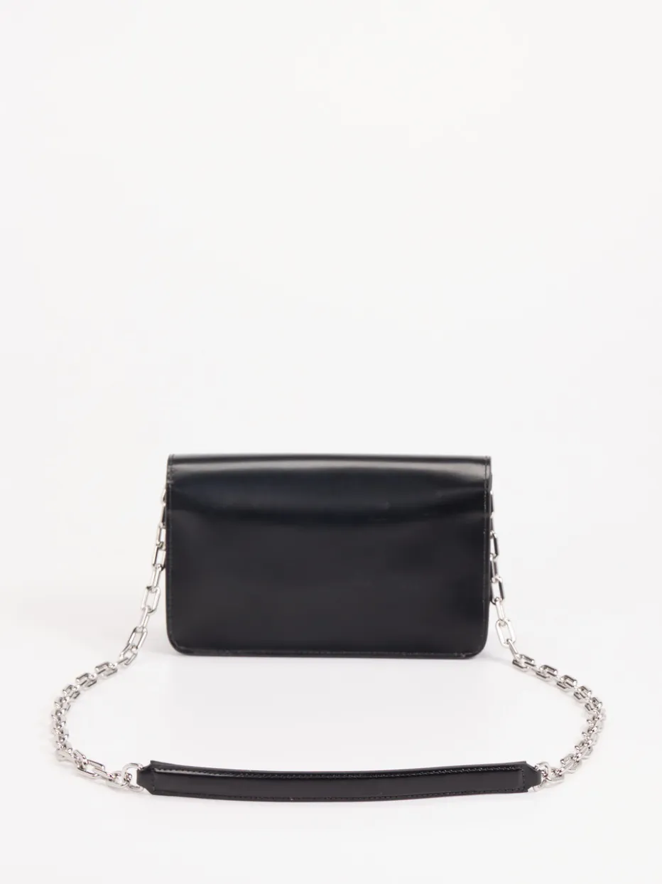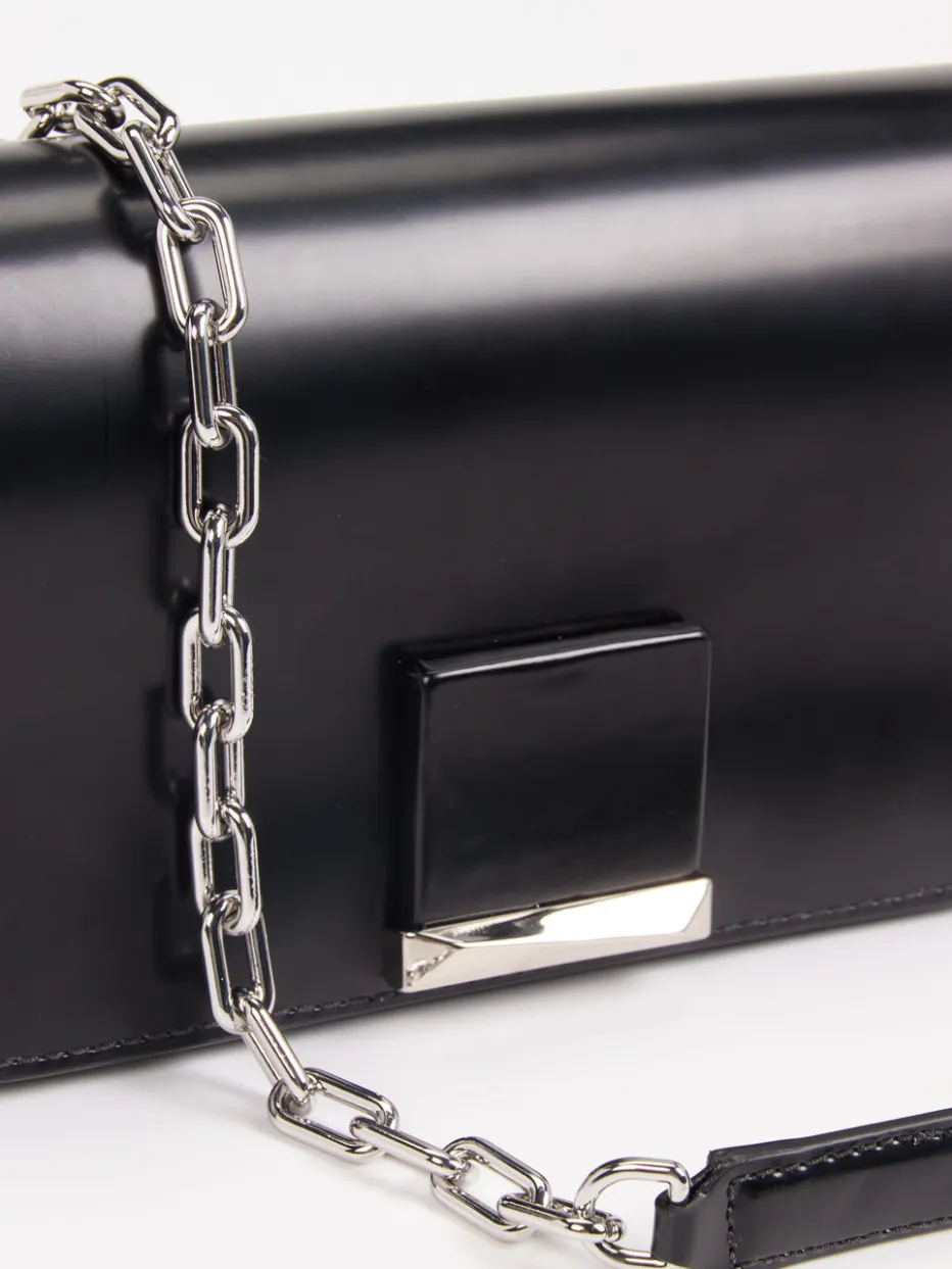 Diese elegante Schultertasche vereint glänzendes Leder mit minimalistischer Formensprache und setzt durch silberfarbene Metall-Details stilvolle Akzente.
