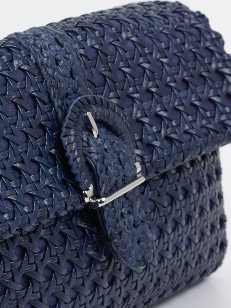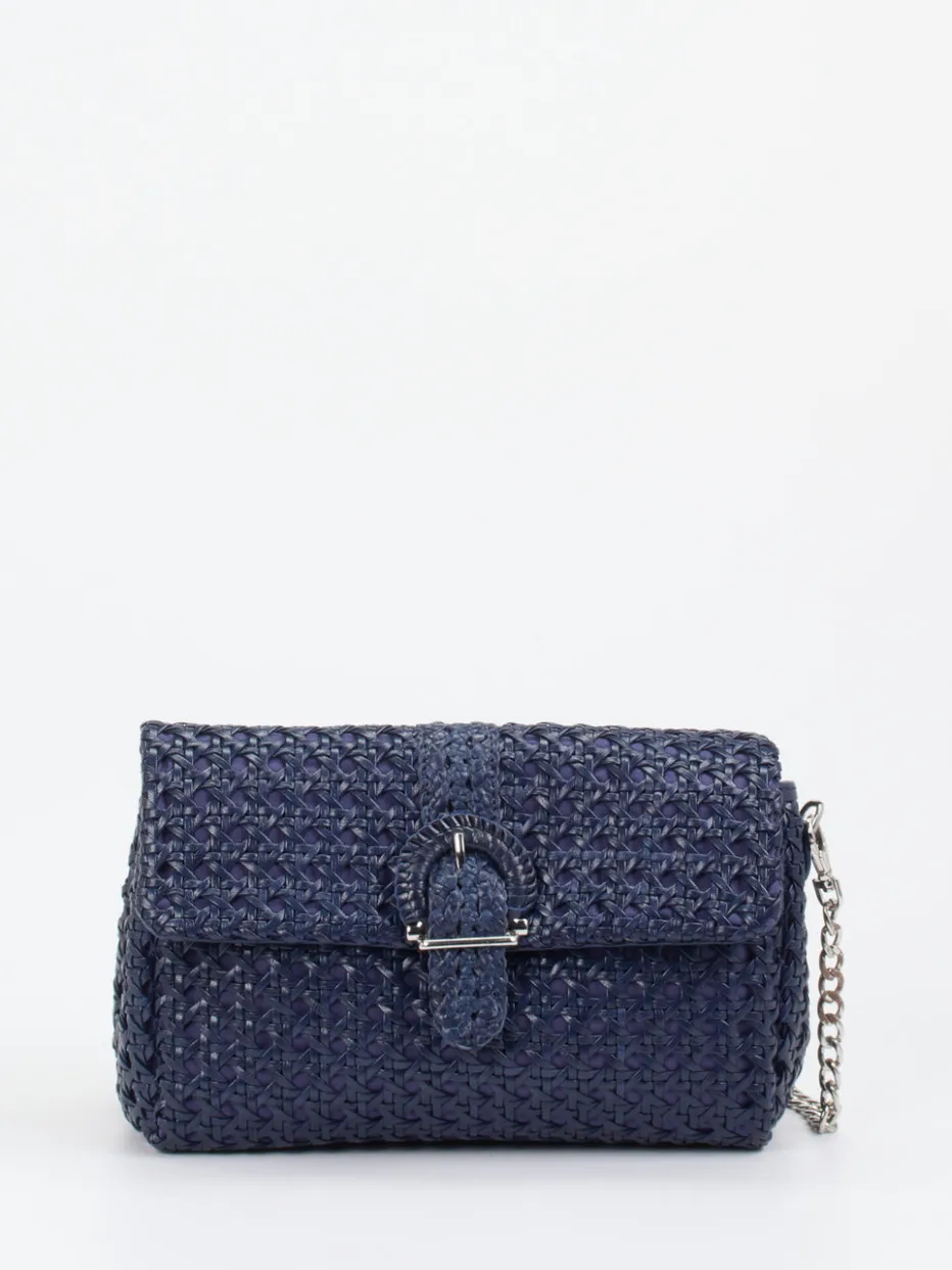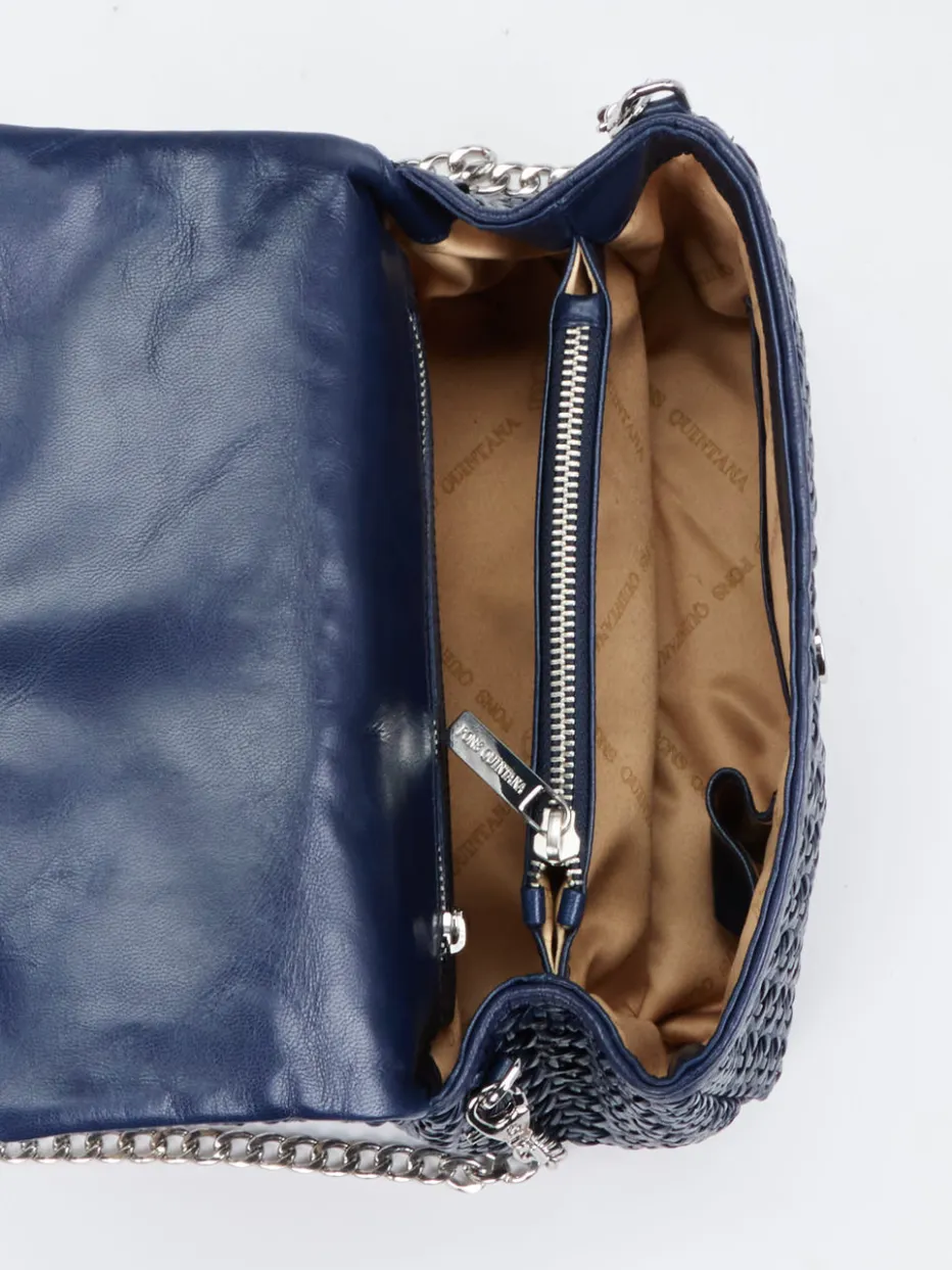 Die kunstvolle Flechtstruktur und die silberfarbene Gliederkette verleihen dieser dunkelblauen Crossbody-Tasche eine elegante Note mit Vintage-Anklang.