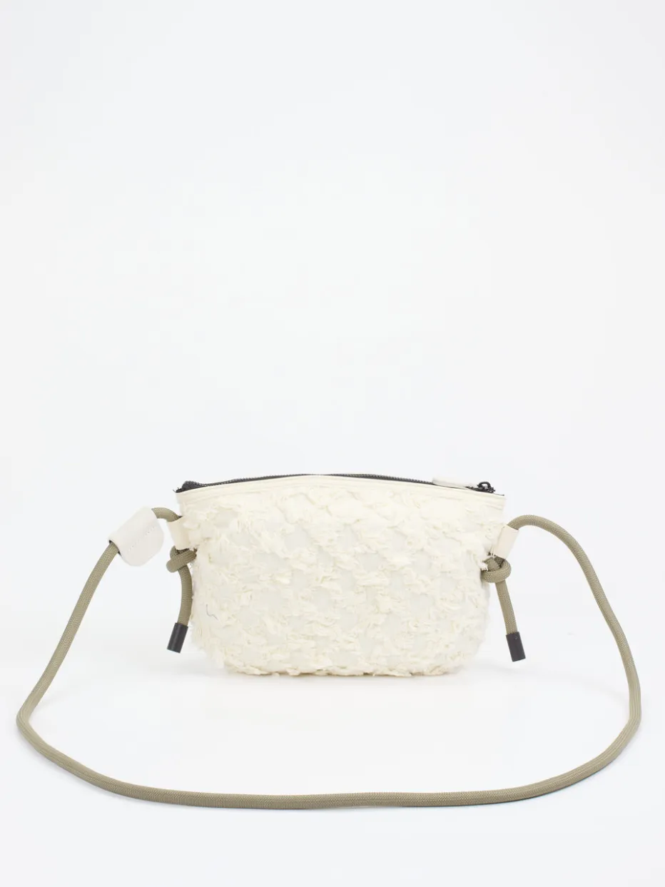Die strukturierte Textiloberfläche und der olivgrüne Kordelriemen verleihen dieser Tasche einen modernen Utility-Touch – perfekt zwischen Alltag und Urlaubsszenerie.