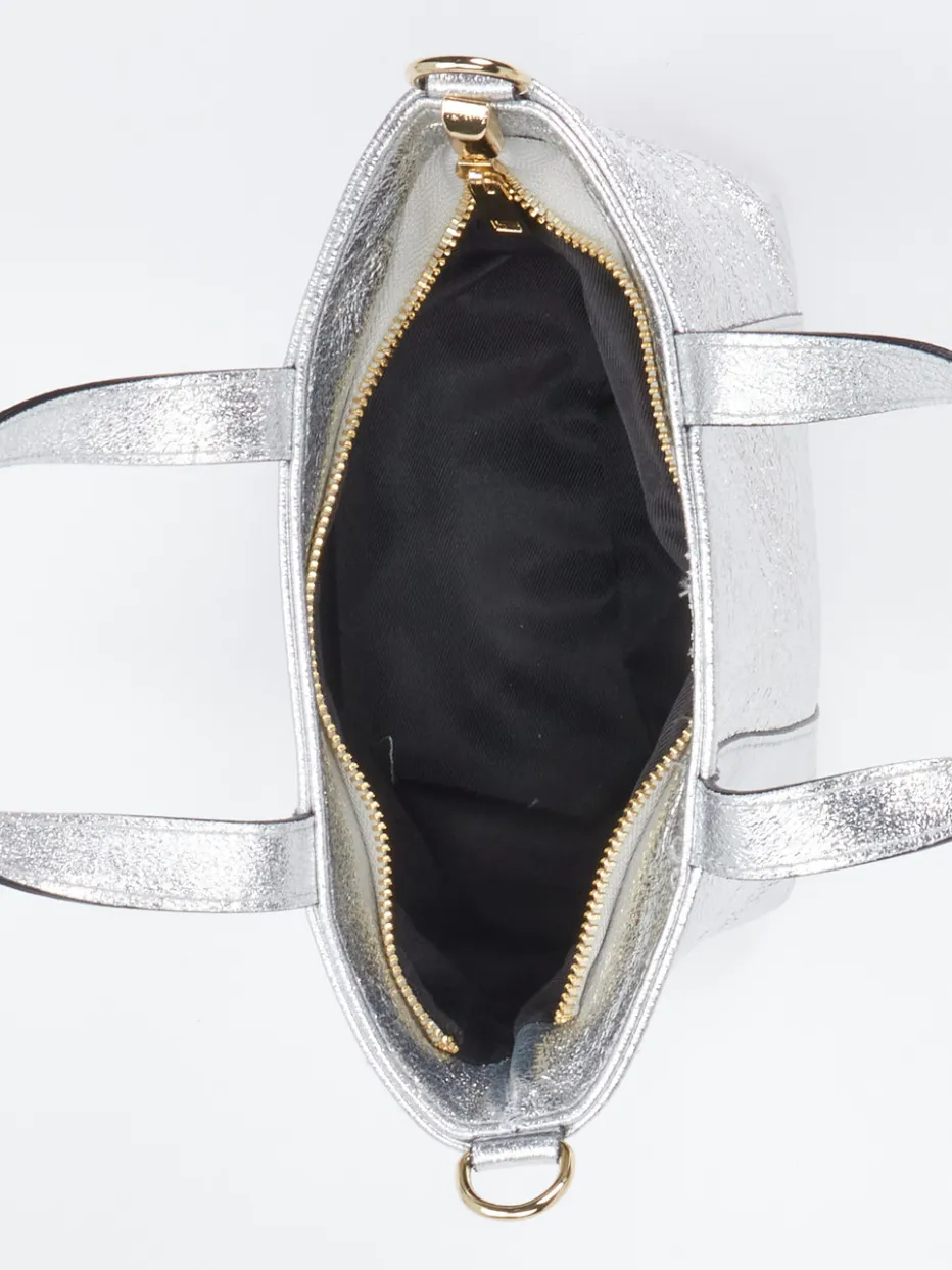 Ein Multitalent für jede Gelegenheit ist diese Umhängetasche von Marlon Firenze! Das Obermaterial aus Metallicleder besticht mit seinem attraktiven Glanz. Die Farbgebung in Silber und die schlichte Silhouette ohne überflüssigen Schmuck bieten nahezu unbegrenzte Kombinationsmöglichkeiten. Ein goldfarbener Reißverschluss ermöglicht ein einfaches Öffnen und Schließen der Tasche. Der geräumige Innenraum verfügt über ein Reißverschlussfach. Zwei Schulterriemen können nach Bedarf ausgetauscht werden und verändern so den Look der Tasche. Zur Wahl stehen ein eleganter, toniger Riemen sowie ein breiter, auffälliger Riemen in Rosa, Gold und Grautönen. Ein Accessoire, das zu begeistern weiß! – Obermaterial: Metallicleder – Futter: Textil – Farbe: Silber < – Größe: ca. 17 x 23 x 9 cm (H x B x T) – breiter Schulterriemen: verstellbar, maximal ca. 115 cm – zweiter Schulterriemen in Silber: verstellbar, max. ca. 100 cm – Verschluss: Reißverschluss