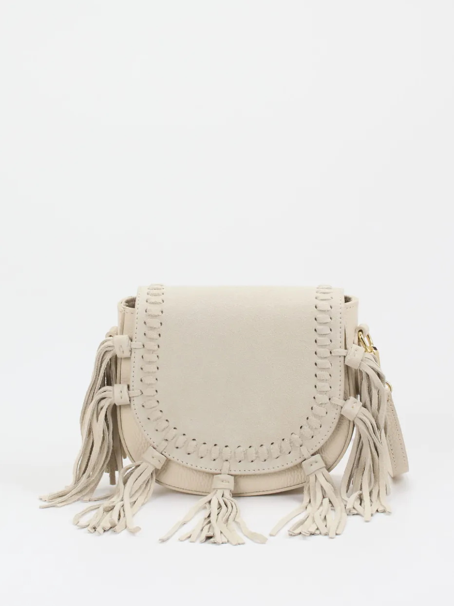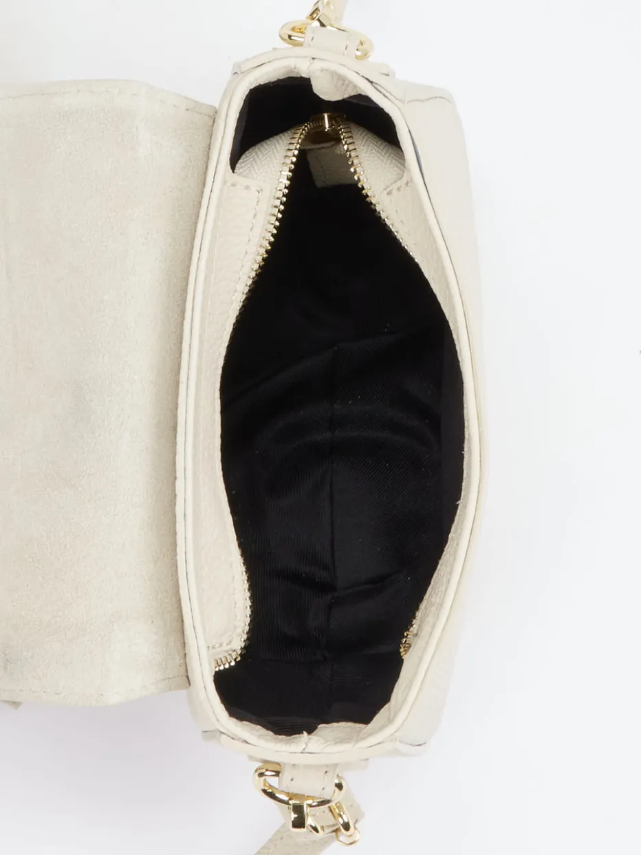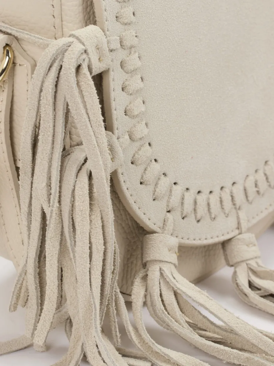 Diese Crossbody-Tasche kombiniert cremefarbenes Kalbleder mit samtigem Velours in halbmondförmiger Silhouette und bündelt Boho-Flair mit italienischer Handwerkskunst.