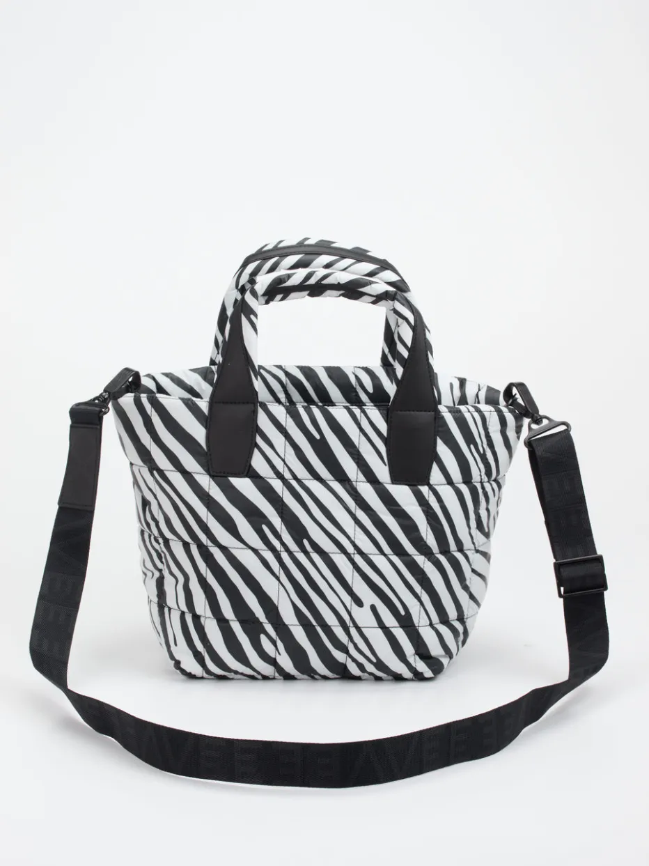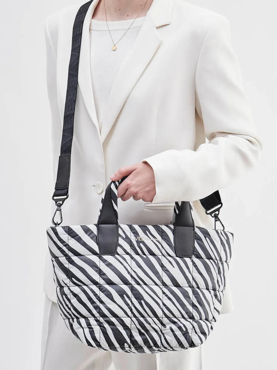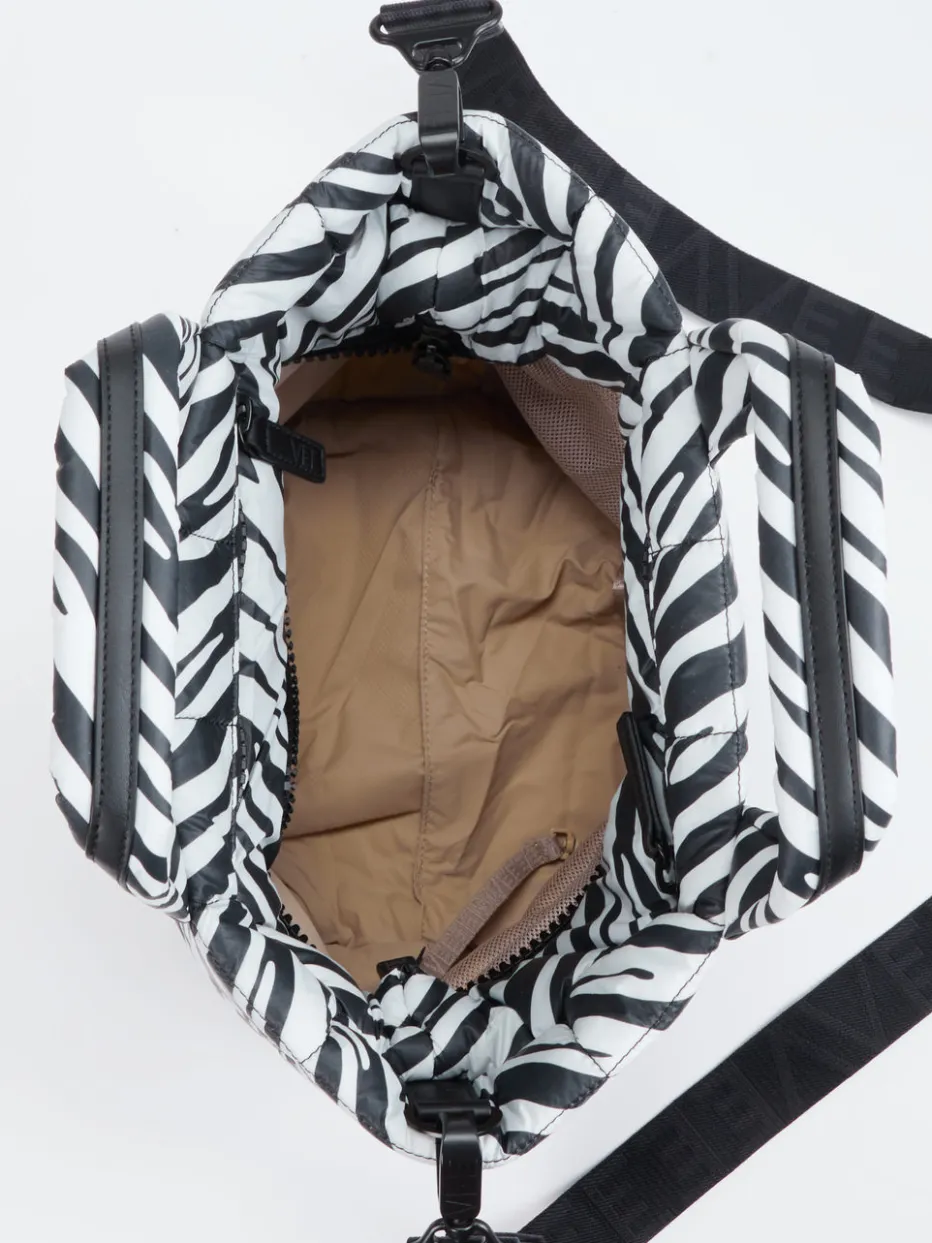 Die gesteppte Tote Bag von VeeCollective Berlin vereint pufferartiges Design mit edgy Zebramuster. Funktional, urban und modisch – ein stilvoller Begleiter für Alltag und Business.
