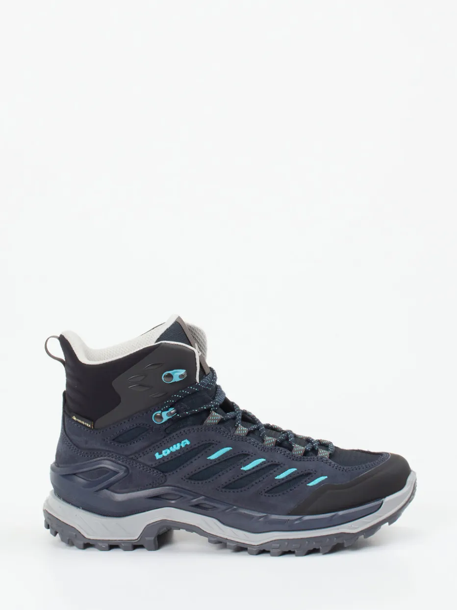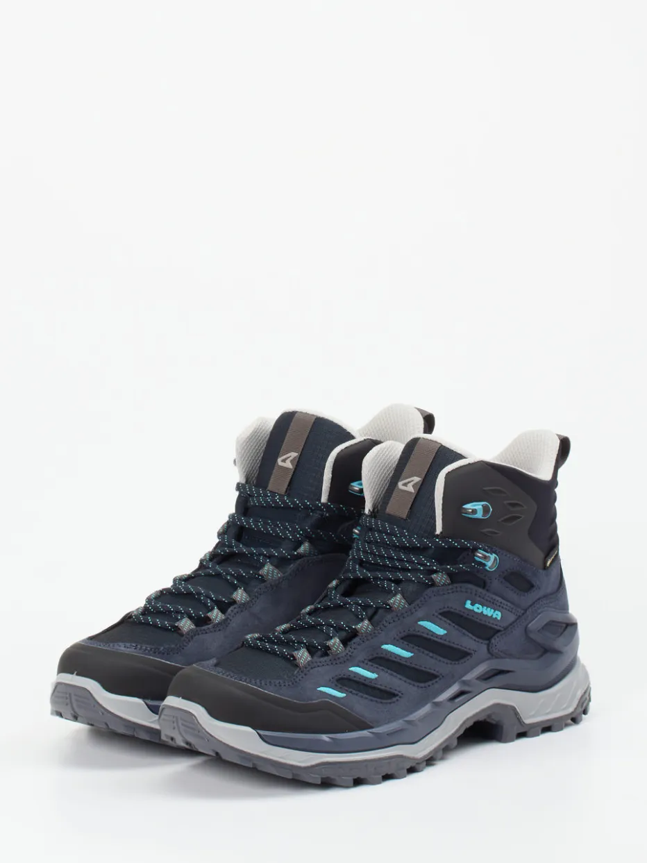 Funktion trifft auf Design.Lowa zeigt mit diesem Mid-Cut-Wanderschuh aus wind- & wasserdichtem Material einen Allrounder für Outdoor und Alltag. Ideal für Wanderungen bei wechselhaftem Wetter: Die GORE-TEX®-Membran sorgt für trockene Füße, während das atmungsaktive Obermaterial mit Textileinsätzen und mattem Finish punktet. Der dunkelblaue Grundton erhält durch hellblaue Schnürösen und Logodetails ein dynamisches Erscheinungsbild. Ergonomische Form, verstärkte Zehenkappe und griffige Vibram®-Sohle bieten Komfort und Halt. Als Element des Gorpcore-Trends lässt sich der Schuh vielseitig kombinieren – etwa mit Funktionshosen oder urbaner Casualwear. Lowa verbindet technische Verlässlichkeit mit progressivem Outdoor-Styling.