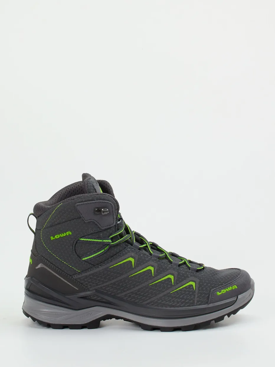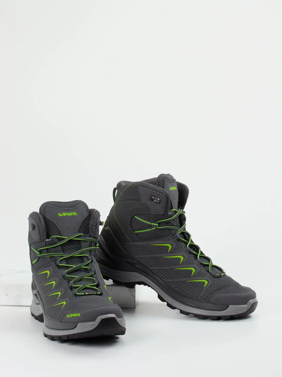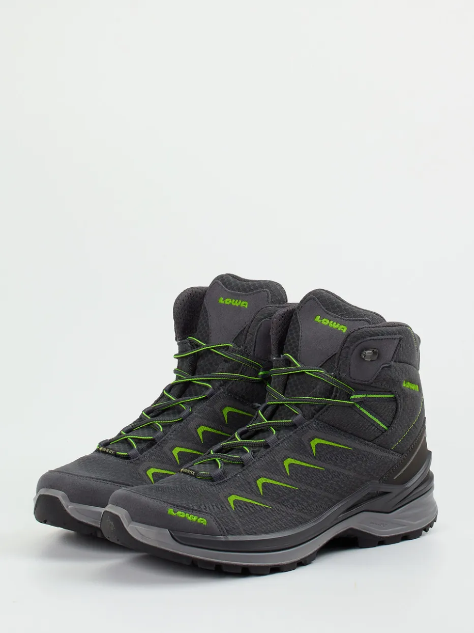 Wetterfestes Design trifft Outdoor-Komfort.Lowa präsentiert mit diesen Wanderschuhen eine funktionale Lösung für anspruchsvolle Einsätze. Ob bei ausgedehnten Wanderungen oder urbanem Einsatz – der Schnürboot überzeugt mit robustem Veloursleder-Textil-Mix und wasserfester GORE-TEX®-Membran. Die anthrazitgraue Oberfläche mit neongrünen Kontrastnähten verleiht dem Schuh einen dynamischen Ausdruck. Die massive, strukturierte Gummisohle sorgt für zuverlässigen Grip, während die knöchelhohe Silhouette Stabilität bietet. Praktische Details wie die Zuglasche und die herausnehmbare Einlegesohle erhöhen Tragekomfort und Funktionalität. Ideal kombinierbar mit funktionaler Outdoorbekleidung. Ein zuverlässiger Begleiter von Lowa mit durchdachter Performance-DNA.