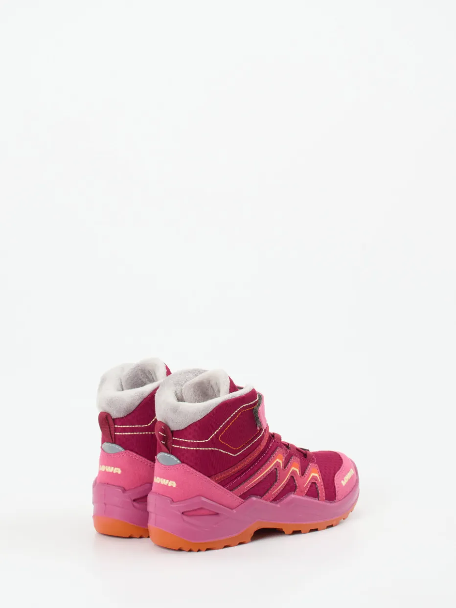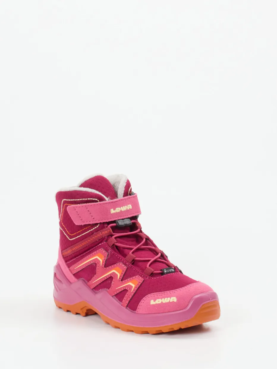 Funktion auf Schritt und Tritt.Lowa präsentiert mit diesen Wanderschuhen ein funktionales Modell für aktive Kinder. Wenn es draußen nass, matschig oder unwegsam wird, sorgt die griffige Gummisohle mit tiefem Profil für Trittsicherheit in jedem Gelände. Das pinkfarbene Veloursleder wird durch samtige Mesh-Einsätze ergänzt und harmoniert mit orangenen und rosafarbenen Kontrasten im Color-Blocking-Stil. Ein Duo aus elastischer Schnellschnürung und Klettverschluss erleichtert den Einstieg, während reflektierende Elemente plus Zuglasche zweckmäßig zur Geltung kommen. Das atmungsaktive Innenfutter mit GORE-TEX-Membran schützt zuverlässig vor Nässe und Kälte. Ideal für Abenteuer mit Komfort – robust, wettertauglich, kindgerecht.
