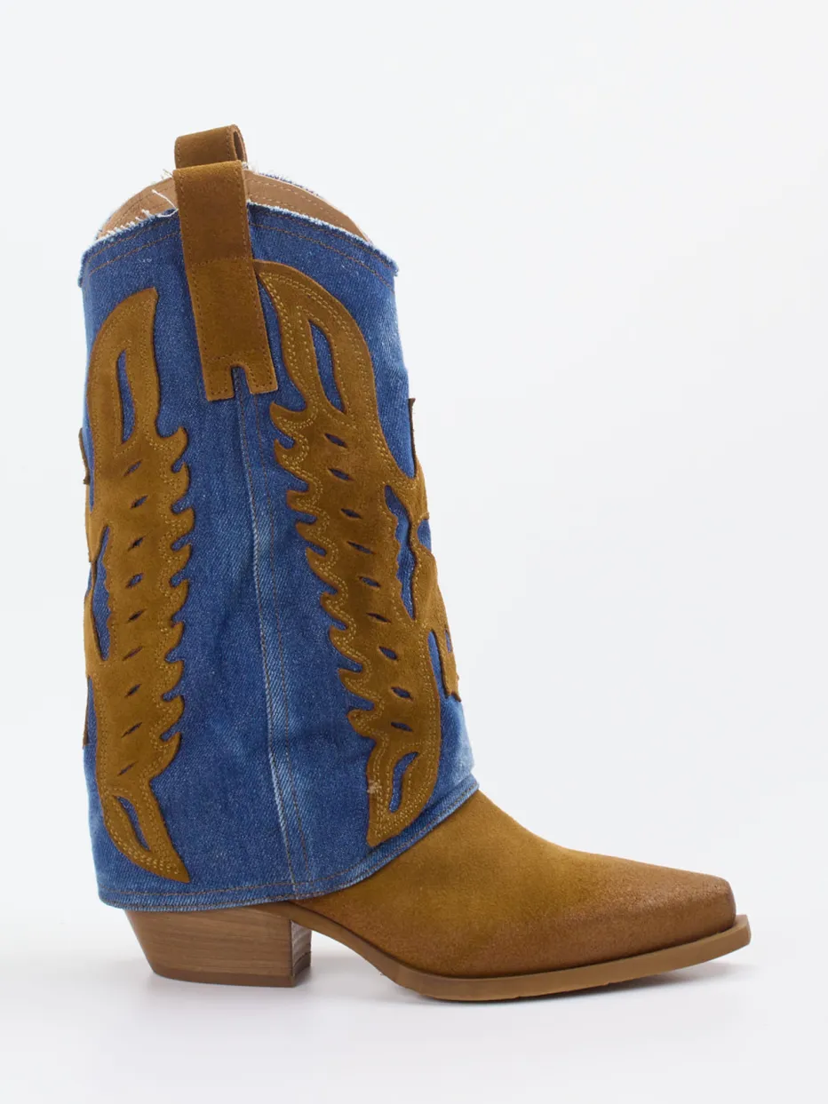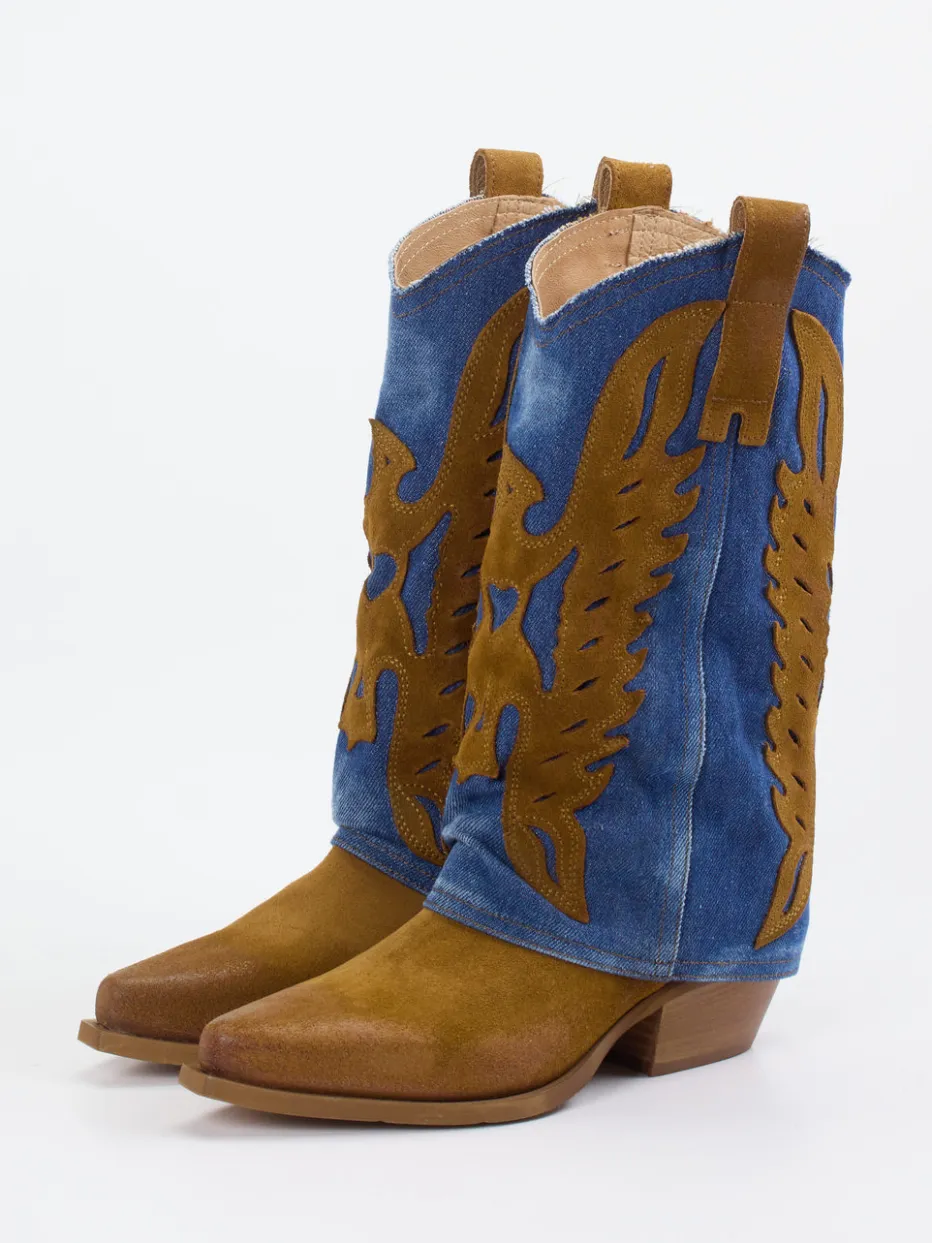 Konstantin Starke interpretiert klassische Westernstiefel für Damen neu: mit echtem Veloursleder und textiler Jeansoptik.