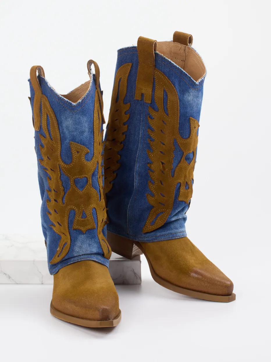 Der cognacbraune Cowboystiefel mit jeansblauem Schaft eignet sich ideal für stilbewusste Freizeit-Outfits oder urbane Festival-Looks. Samtig genarbtes Veloursleder trifft auf robusten Denim mit charakteristischer Adler-Applikation – stilistisch ergänzen Zuglaschen und ein abgeschrägter Blockabsatz in Holzoptik das Design. Der bequeme Schlupfeinstieg und das Lederfutter bieten angenehmen Komfort. Inspiriert vom Denim-Revival ist dieses Modell ein selbstbewusstes Fashion Statement.