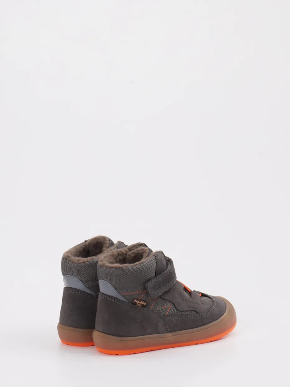 Ideal für kalte Tage auf dem Spielplatz oder beim Waldspaziergang: Diese knöchelhohen Winterboots bestehen aus grauem Veloursleder mit matter Oberfläche und sind innen warm mit Wolle gefüttert. Kontrastnähte in Orange, ein reflektierender Fersenbesatz sowie ein praktischer Klettverschluss mit Gummischnürung bieten Alltagstauglichkeit und Sichtbarkeit. Die profilierte, orangefarbene Gummisohle sorgt für sicheren Halt bei jedem Wetter. Inspiriert von Outdoorwear und Streetwear passen sie bestens zu lässiger Winterkleidung.