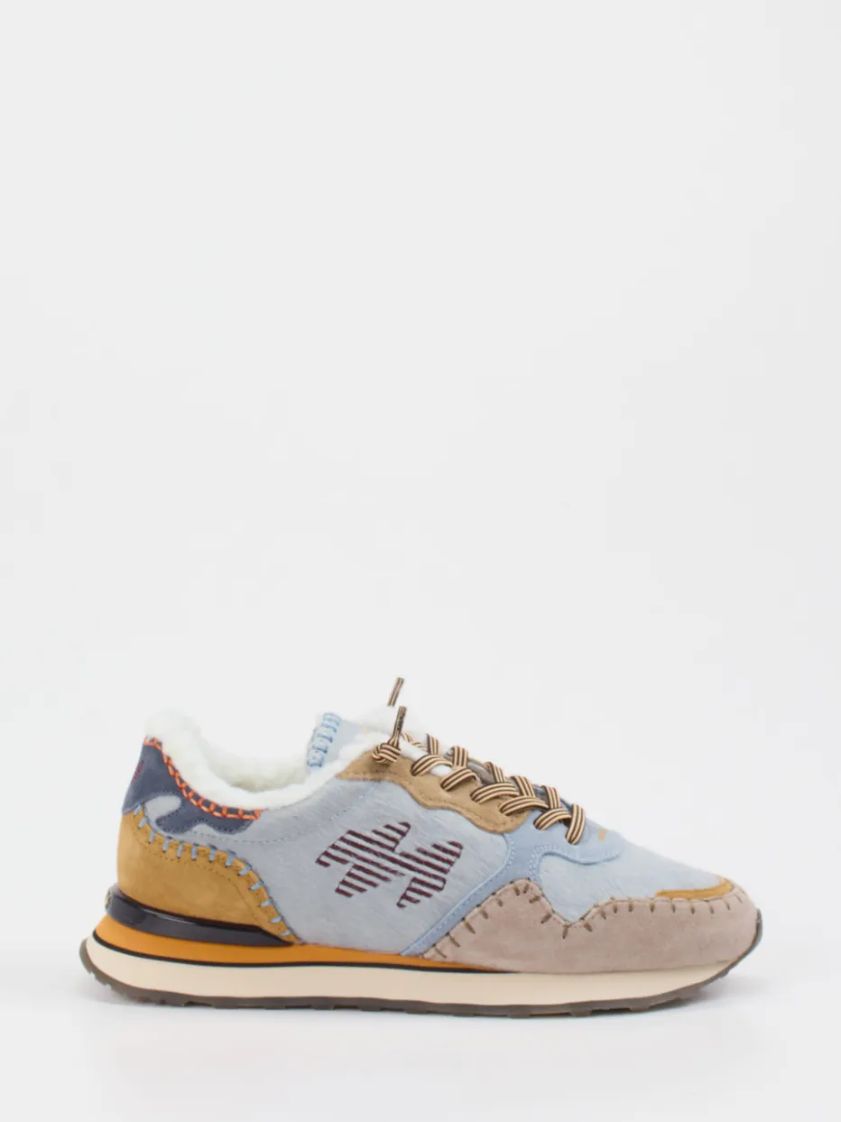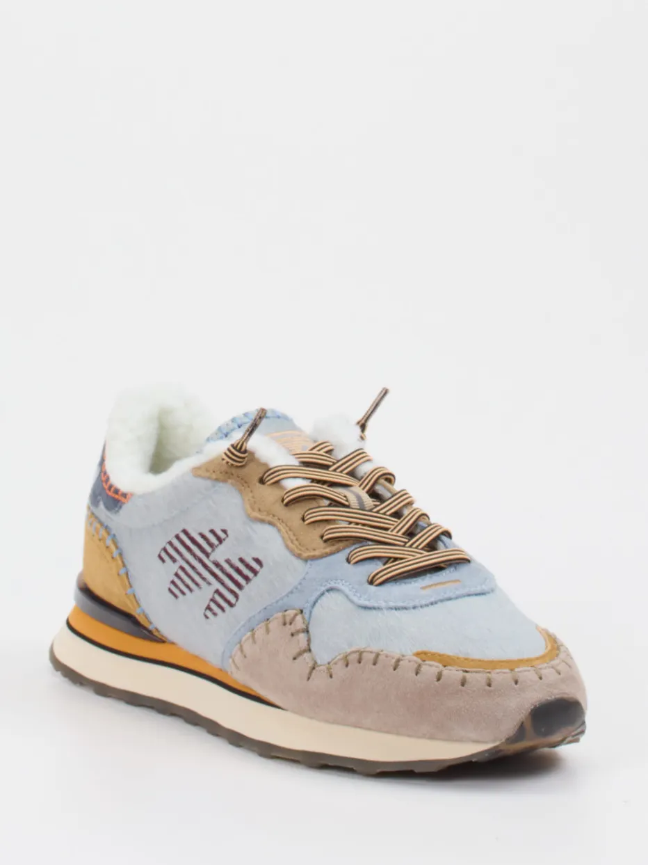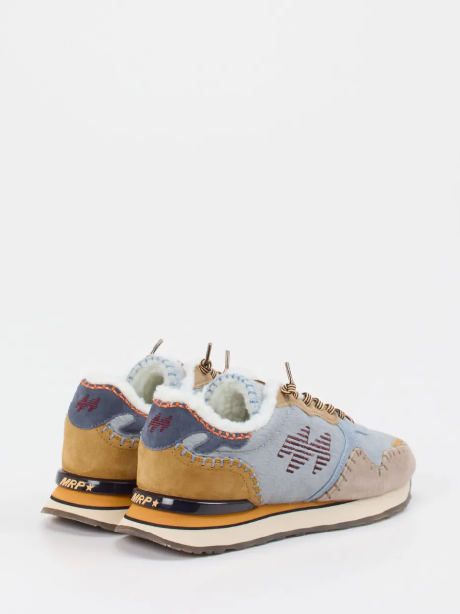 Wärmender Komfort trifft Retro-Charme.MRP zeigt mit diesem damenspezifischen Winter-Sneaker ein stilvolles Modell für die kalte Jahreszeit. Ideal für entspannte Alltagsmomente an kühlen Tagen: Der Sneaker aus Textil überzeugt durch samtig gebürstete Veloursleder-Details, gefüttert mit weichem Kunstfell für angenehme Wärme. Das Design in Pastellblau mit beigen und braunen Farbflächen greift die Retro-Runner-Silhouette auf und wird durch prägnante Kontrastnähte und eine gestickte Logo-Applikation akzentuiert. Zweifarbige Schnürsenkel und eine durchscheinende Gummisohle mit Outdoor-Profil ergänzen die sportlich-casual Optik. Teil aktueller Cozy-Outdoor- und Craftcore-Trends, passt das Modell hervorragend zu Strick & Parka. Der MRP-Look bietet funktionales Design für stilbewusste Wintertage.