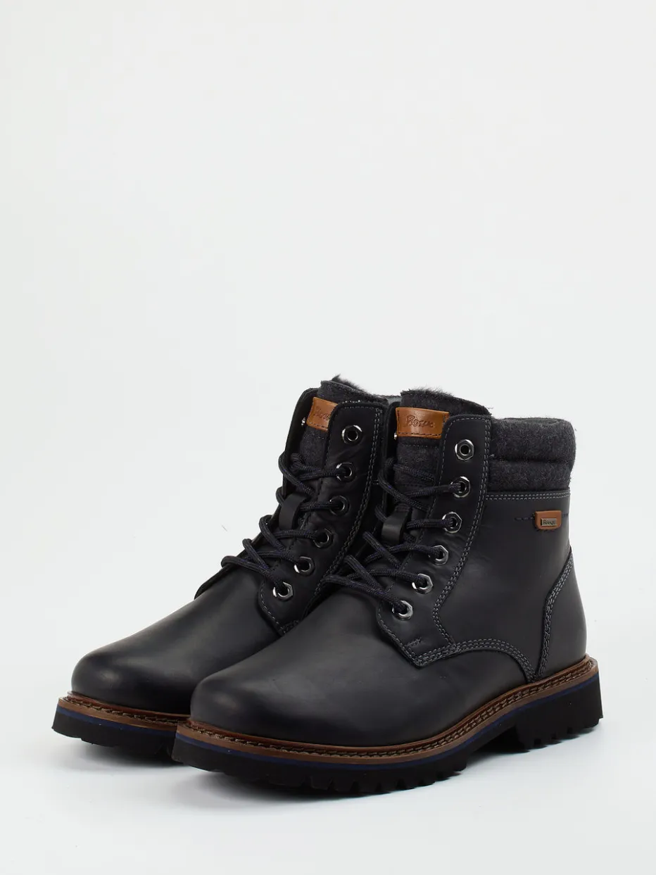 Wetterfest durch Herbst und Winter.Die Herren-Winterboots von Sioux vereinen stilvolle Workwear-Anleihen mit durchdachter Funktionalität. An kühlen Tagen punkten die knöchelhohen Boots mit wetterfestem Fettleder in mattem Schwarz und einem wärmenden Innenfutter aus echtem Lammfell. Die stark profilierte Gummisohle mit blauem Akzentrand bietet sicheren Grip, auch auf nassem Untergrund. Tonige Kontrastnähte, ein gepolsterter Schaftrand und dunkelblaue Schnürsenkel setzen dezente Designakzente. Für Komfort sorgen die großzügige Weite H, eine herausnehmbare Innensohle und der praktische Innenreißverschluss. Ein langlebiger Begleiter mit klarer Formensprache – ideal für den urbanen Alltag und leichte Outdoor-Aktivitäten.