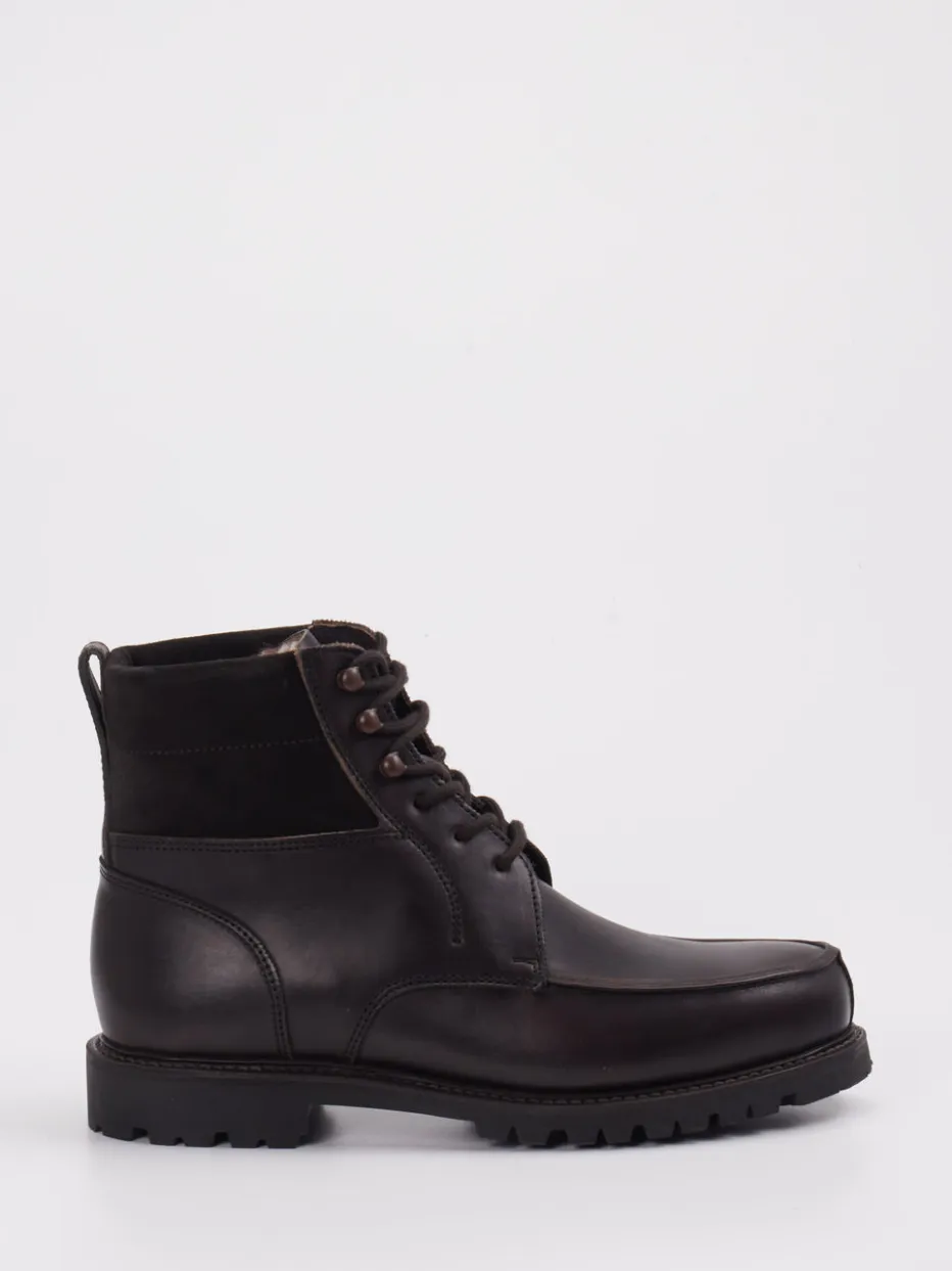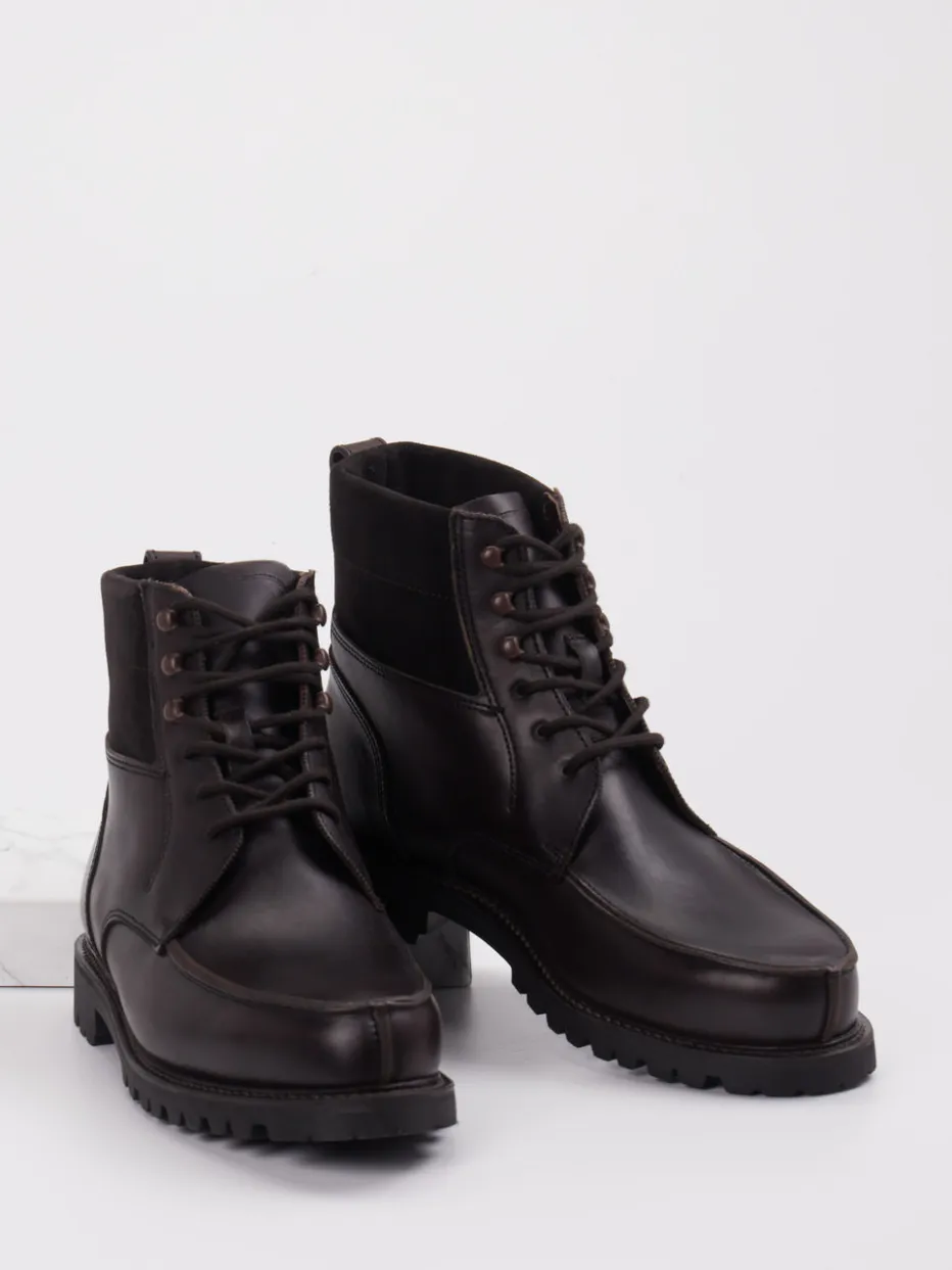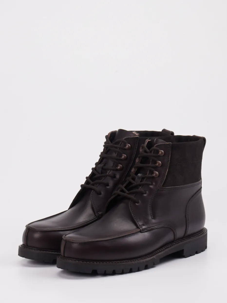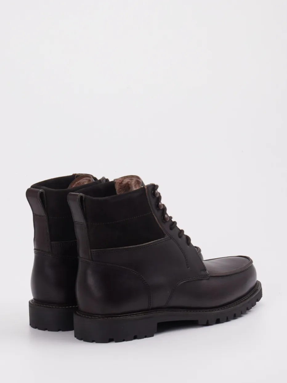 Ideal für urbane Streifzüge bei winterlichen Bedingungen: Die Boots bestehen aus fein verarbeitetem Kalbleder mit samtig angeschliffenen Velours-Partien und präsentieren sich in einem dunklen Braunton mit matter Oberfläche. Eine tonale Schnürung mit Metallösen, klassische Silhouette und markante Zuglasche unterstreichen den Utility-Look. Im Inneren sorgt warmes Lammfellfutter für angenehmen Tragekomfort. Die griffige Gummisohle verleiht Trittsicherheit auf nassem oder gefrorenem Untergrund. Passt hervorragend zu gefütterten Jacken und dunklen Denim-Looks.