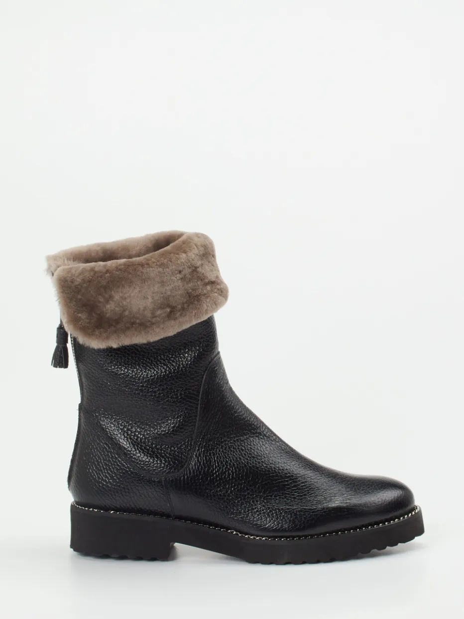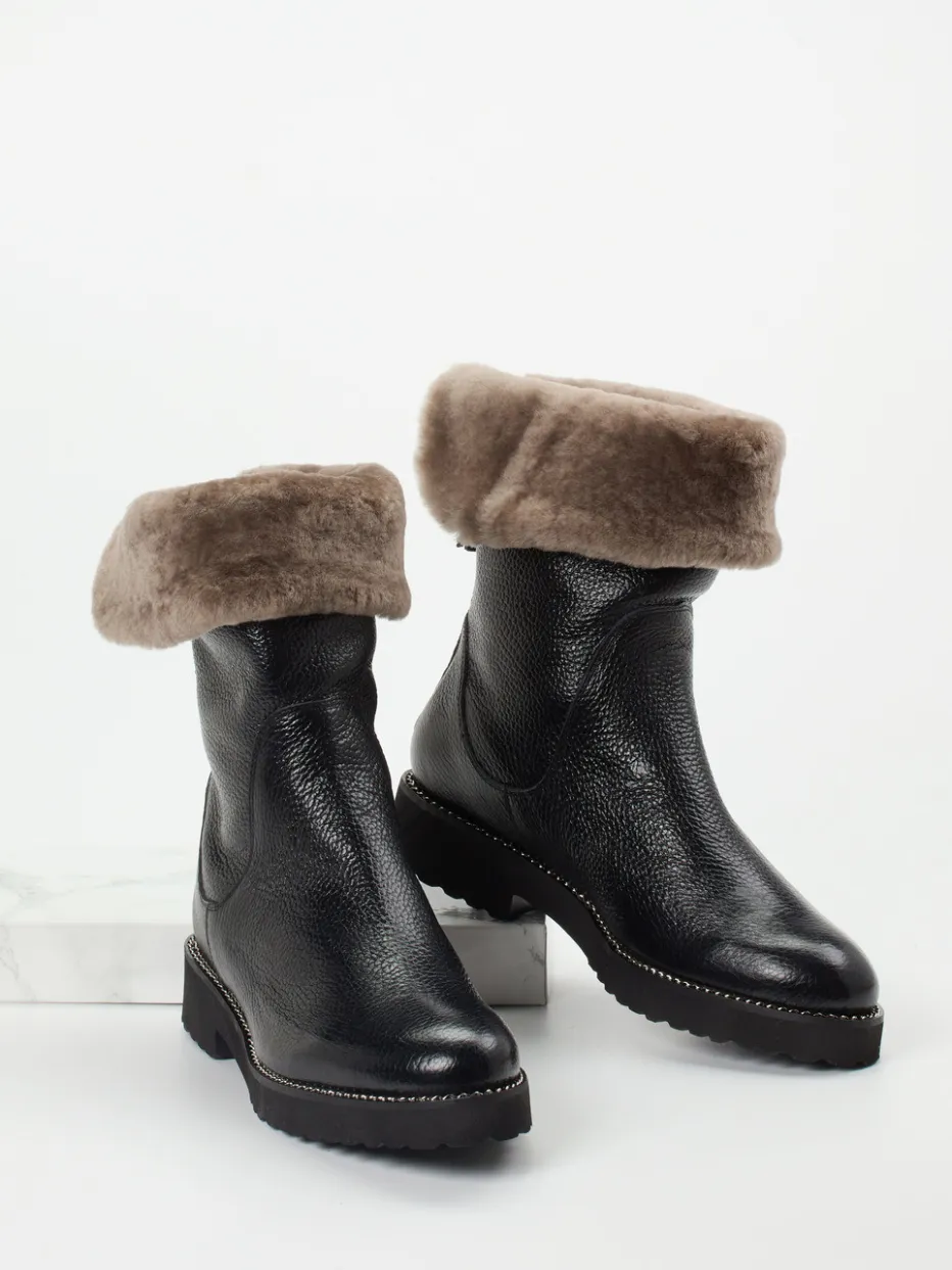 Warmer Luxus für kalte Tage.Mannori vereint bei diesen Damen-Winterboots Funktionalität mit stilvollem Understatement. Der schwarze Kalbleder-Stiefel mit samtiger Narbung und taupefarbenem Echtfell-Umschlag überzeugt durch klare Silhouette, einen rückseitigen Reißverschluss mit silberner Troddel und einer rutschfest profilierten Leichtzellsohle. Das kuschelige Lammfellfutter sorgt für wohlige Wärme an frostigen Tagen – ideal bei urbanen Alltagswegen wie bei Winterspaziergängen. Dezente Steppnähte und ein Ketten-Detail an der Sohle akzentuieren den minimalistischen Alpin-Look. Markanter Komfort trifft auf langlebige Qualität für einen stilbewussten Winter.