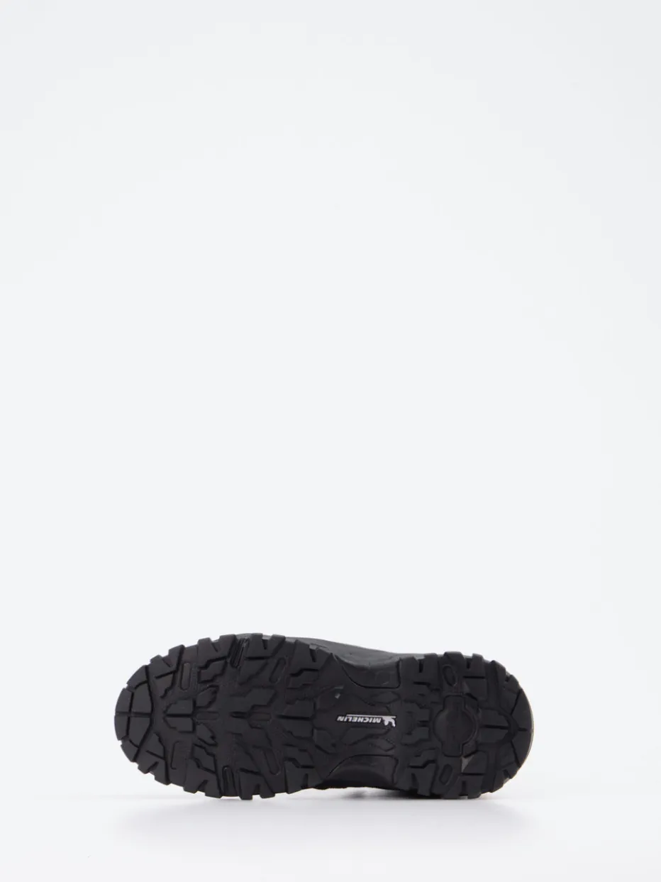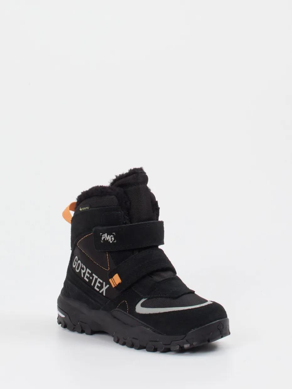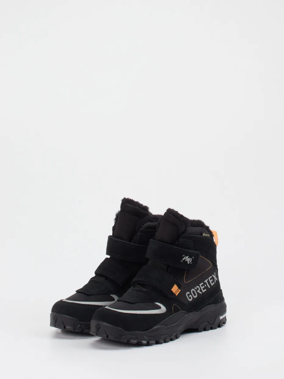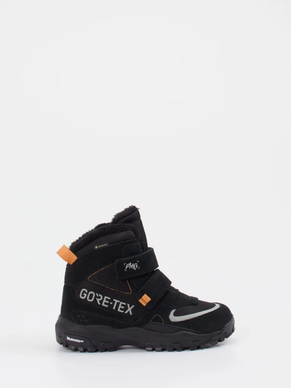 Wetterfest durch Herbst und Winter.Primigi liefert mit diesen Winterboots ein wetterfestes Schuhwerk für Kinder. Die Kombination aus hochwertigem Veloursleder und einer GORE-TEX-Membran bietet zuverlässigen Schutz vor Nässe und Kälte. Das matte Schwarz wird durch orangefarbene Zierdetails und reflektierende Elemente akzentuiert – ideal für Sichtbarkeit im Straßenverkehr. Die hochgeschlossene Silhouette mit praktischen Klettverschlüssen erleichtert den Einstieg, während die Michelin-Gummisohle für sicheren Halt auf rutschigem Untergrund sorgt. Stilistisch trifft das Modell auf aktuelle Gorpcore- und Techwear-Trends. Ein funktionsstarker Begleiter mit bewährter Primigi-Qualität für Alltag und Abenteuer.