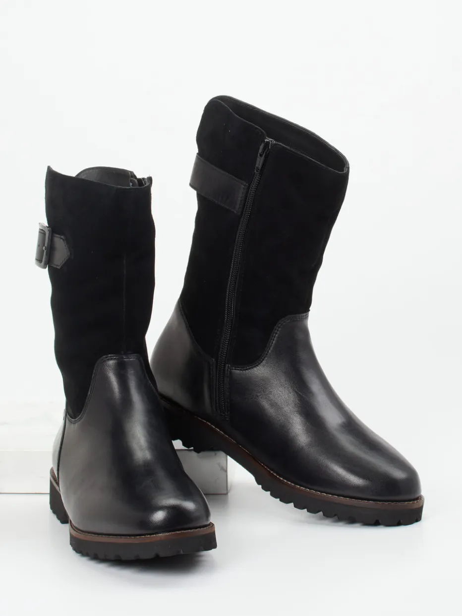 Stilsicher durch Schnee und Alltag.Die Marke Sioux präsentiert diese komfortable Damen-Stiefelette in klassischer Schwarzoptik. Ideal für nasskalte Tage bietet das Modell dank wind- und wasserdichtem Material sowie Lammfellfutter hohen Schutz und Wärme. Der Materialmix aus glattem und samtigem Leder erzeugt spannende Kontraste, ergänzt durch eine dezent glänzende Schnalle und Ziernaht an der Sohle. Die leicht abgerundete Form, ein seitlicher Reißverschluss und das wechselbare Fußbett in Weite H liefern Tragekomfort auf höchstem Niveau. Minimalistische Linien treffen auf Utility-Elemente – im Trend „Functional Footwear“. Harmoniert besonders gut mit Thermo-Leggings oder Parka. Sioux-typisch vereint der Stiefel funktionale Raffinesse mit elegantem Design.