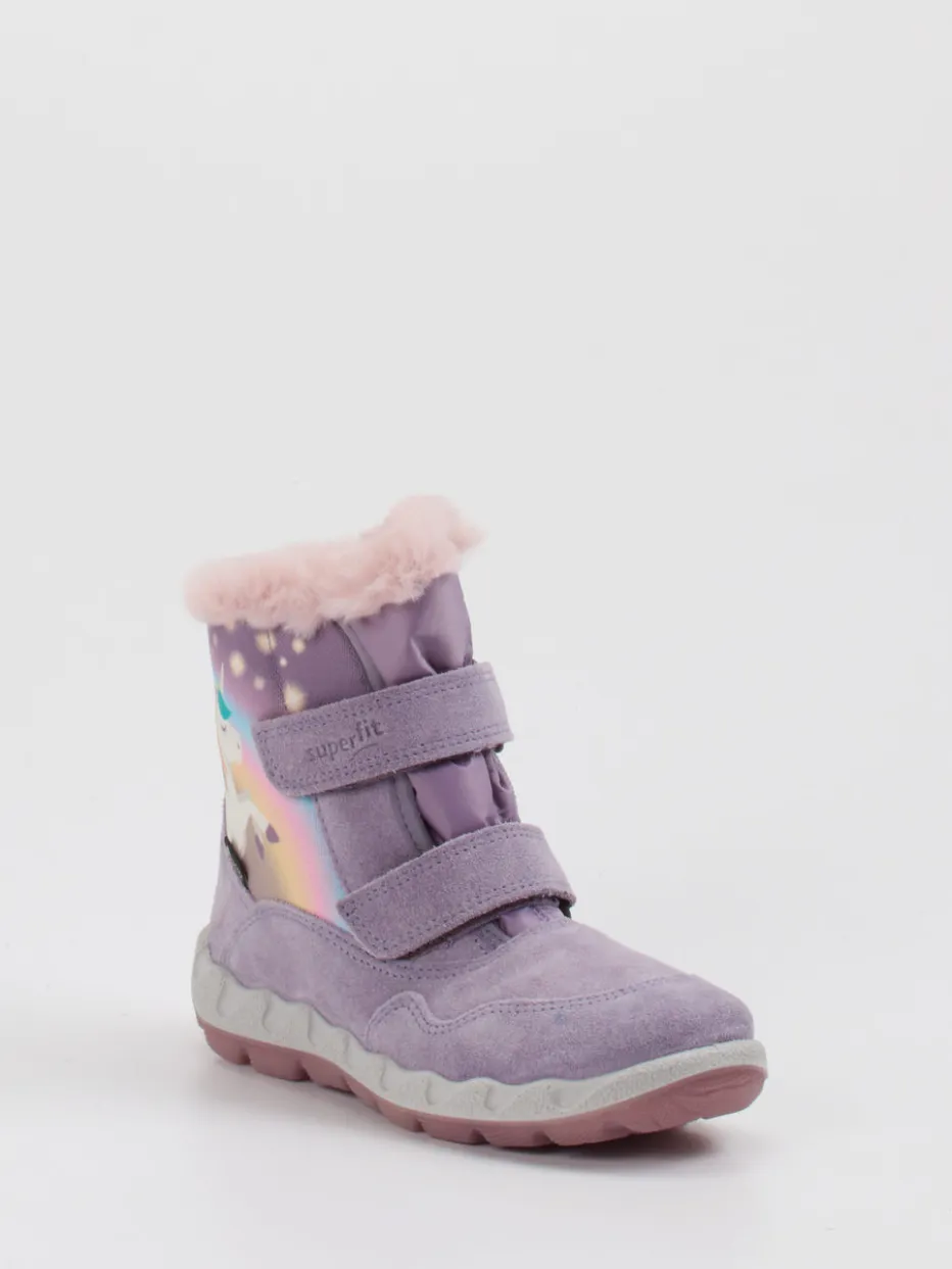 Der Kinder-Winterstiefel von Superfit kombiniert weiches Veloursleder mit GORE-TEX-Membran für trockene, warme Füße und sticht mit farbenfrohem Einhorn-Design hervor.
