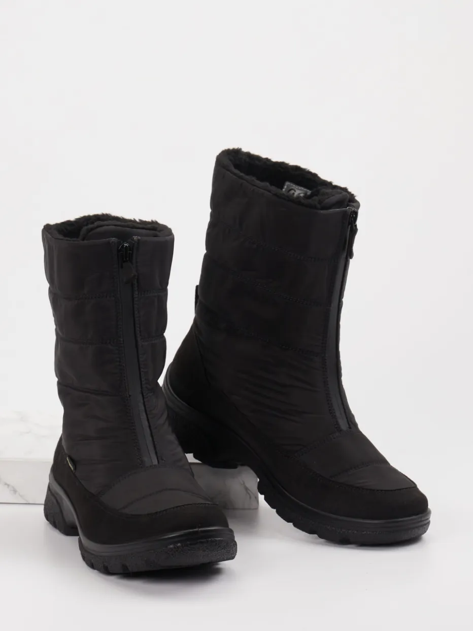 Funktionalität trifft Winterkomfort. Ara präsentiert mit diesem Damen-Winterstiefel eine wetterfeste Lösung für kalte Tage. Die Stiefelette kombiniert wind- und wasserdichtes Außenmaterial mit einer gesteppten, matten Oberfläche und warmem Textilfutter in Felloptik. In klassisch-runder Form gehalten, sorgt der mittelhohe Schaft mit Frontreißverschluss und hinterer Zuglasche für angenehmen Ein- und Ausstieg. Das dezente Gore-Tex-Logo verweist auf die atmungsaktive Schutzfunktion. Die PU-Laufsohle ist griffig profiliert – ideal für nasse Wege oder winterliche Spaziergänge. Trendästhetisch ist der Look inspiriert von Gorpcore und Outdoor-Wear. Perfekt für alle, die Stil und Funktion im Alltag vereinen möchten.