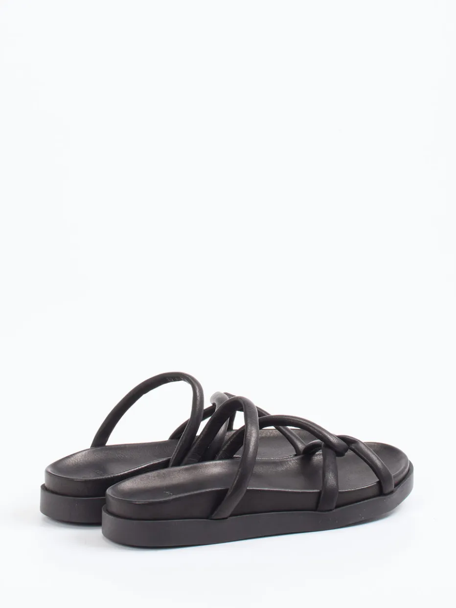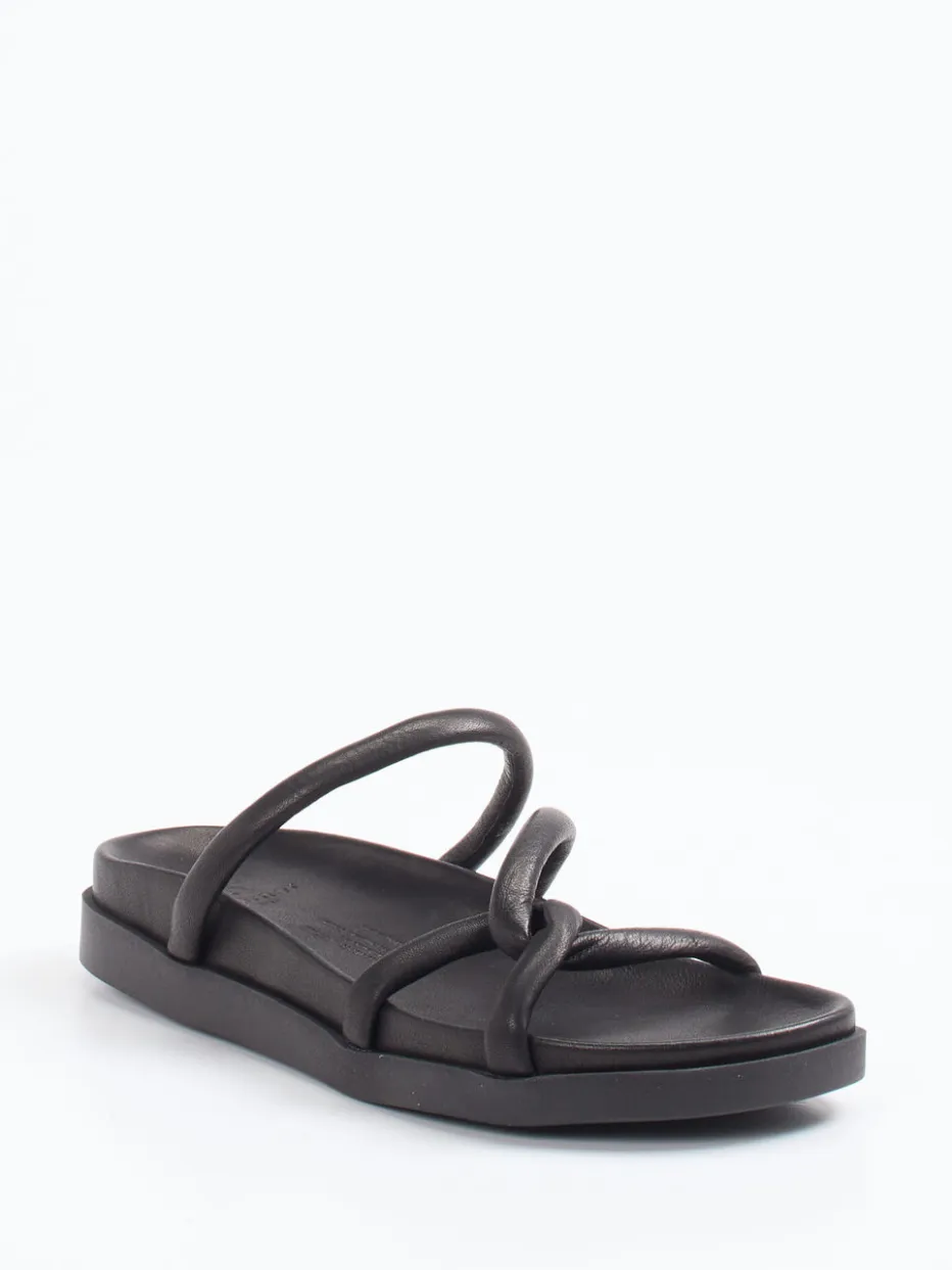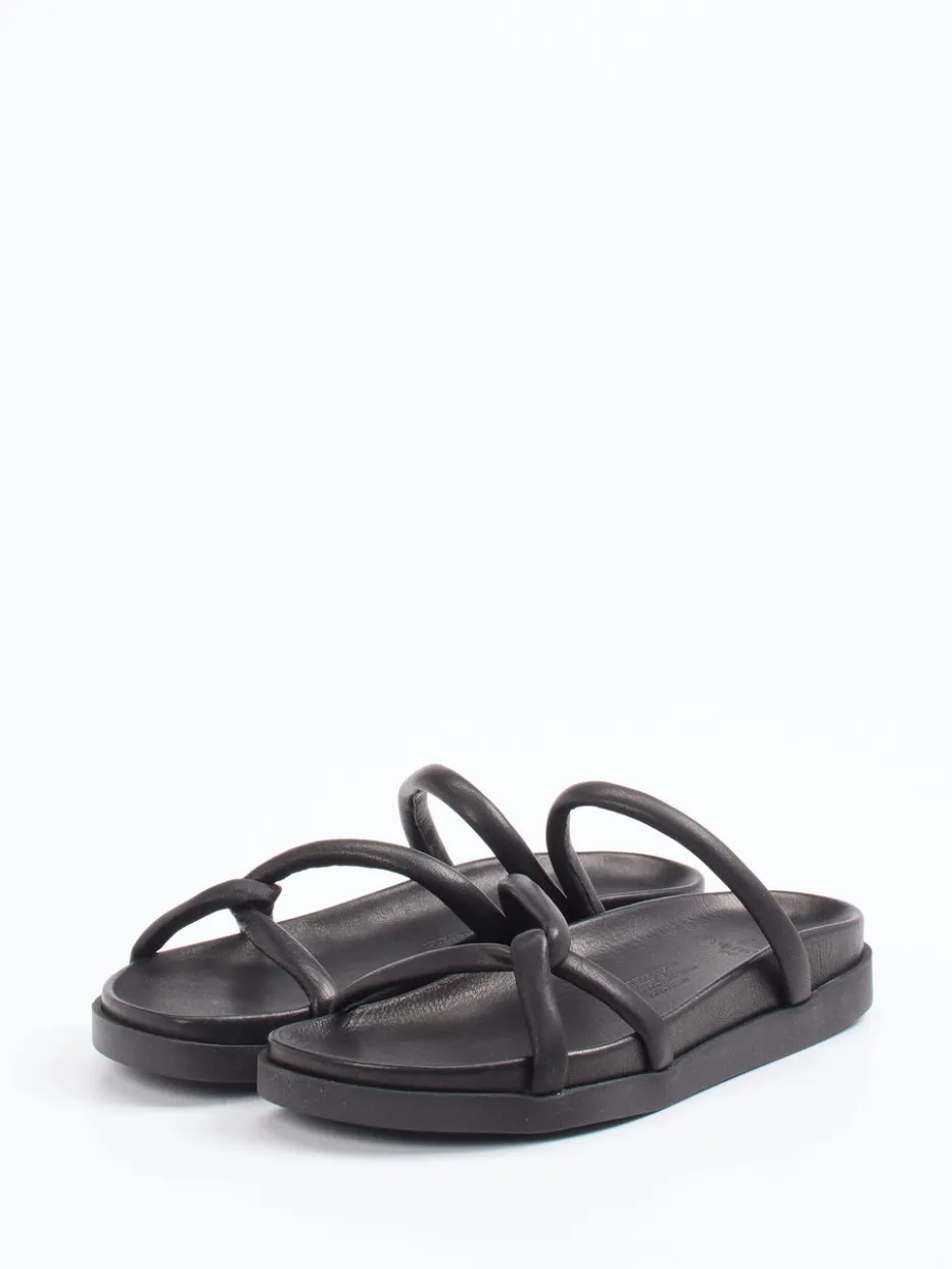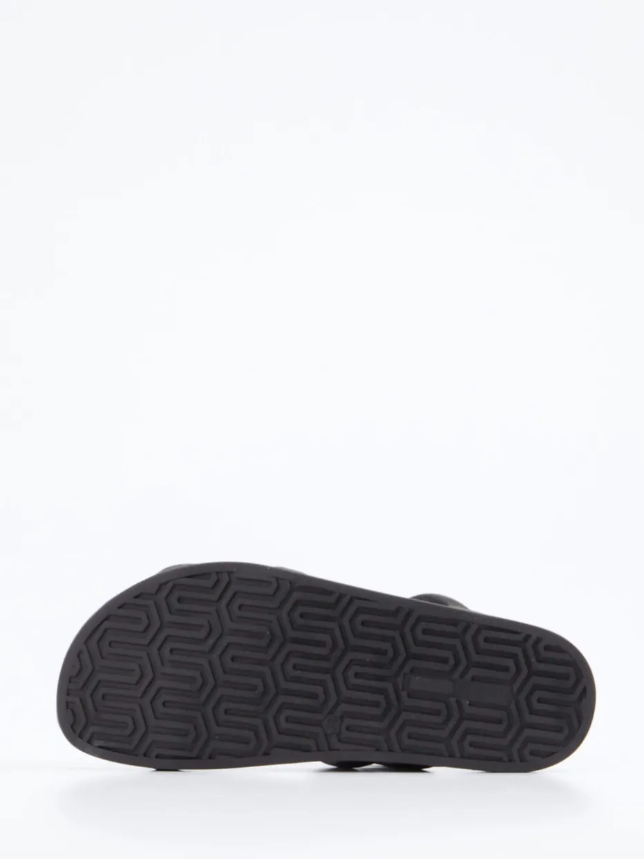 Perfekt für Stadtspaziergänge oder entspannte Urlaubsmomente: Die Sandale präsentiert sich in tiefschwarzem Kalbleder mit matter Oberfläche und komfortabel gepolsterten Riemen. Die flache, leicht eckige Fußform betont das dezente Design, während die strukturierte Gummilaufsohle sicheren Halt verleiht. Die offene Schlupfform unterstreicht den unkomplizierten Charakter. Modisch greift sie den „Quiet Luxury“-Trend auf und passt ideal zu Looks mit Leinenhose oder Crossbody-Tasche.