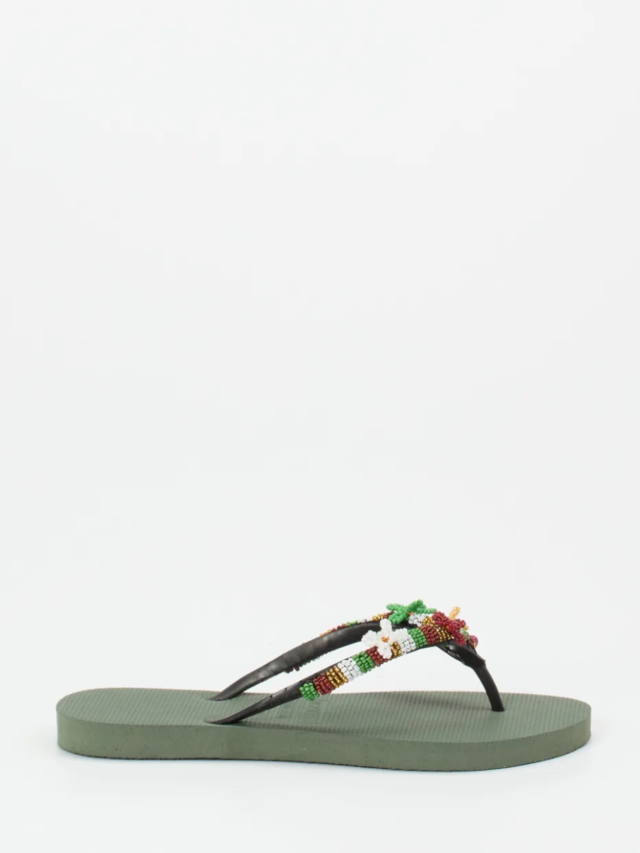 Boho-Vibes für den Sommer.Uzurii präsentiert eine verspielte Zehentrenner-Sandale für Damen. Das Design verbindet Komfort mit ausdrucksstarkem Boho-Stil. Ideal für Strandspaziergänge und sommerliche Freizeitlooks bieten die flachen Sandalen eine weiche, rutschhemmende Gummisohle in Olivgrün. Die klassischen Riemen sind mit kunstvoller Perlenstickerei in floralen Motiven besetzt und setzen verspielte Akzente. Die Schlupfform erlaubt ein unkompliziertes Hineinschlüpfen, während die matte Oberfläche und die detaillierte Perlenverzierung zum Trendthema „Handcrafted Details“ passen. Harmoniert besonders gut mit Maxikleidern oder leichten Leinenhosen. Boho-Chic trifft brasilianisches Lebensgefühl in hochwertiger Verarbeitung.