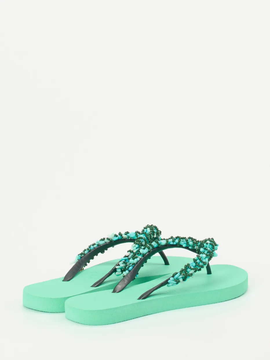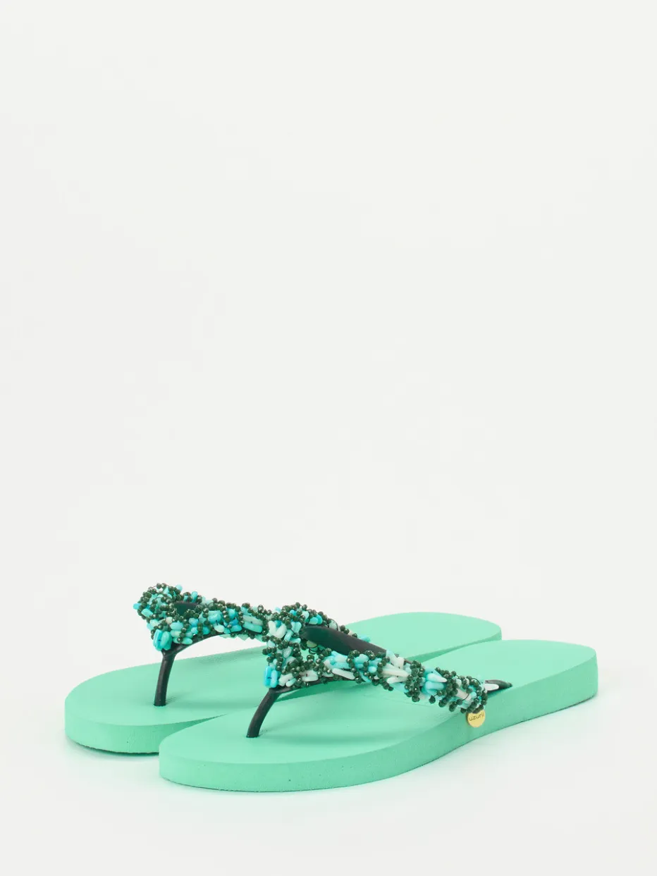 Stilvoll durch den Sommer.Uzurii präsentiert mit diesen Damen-Zehentrennern ein Modell für entspannte Sommertage. Die leichte Gummisohle in Mintgrün bietet angenehmen Tragekomfort und bildet einen dezenten Hintergrund für den aufwendig verzierten Zehenriemen. Türkis- und grünfarbene Perlen wurden von Hand mit schwarzem Draht vernäht und setzen verspielte Akzente. Die klassische, flache Silhouette ohne Verschluss macht das Modell zum unkomplizierten Begleiter für Strand, Freizeit und Urlaub. Ein goldfarbener Markenanhänger rundet das Design elegant ab. Ideal kombinierbar mit luftigen Strandkleidern und Kaftans. Handgearbeitete Details treffen auf tropisch-inspiriertes Design mit Wiedererkennungswert.