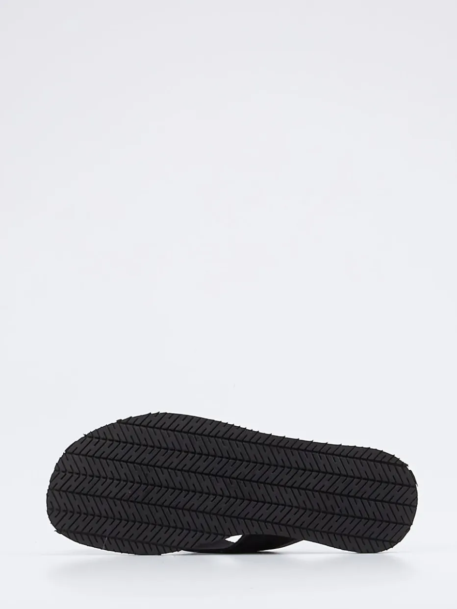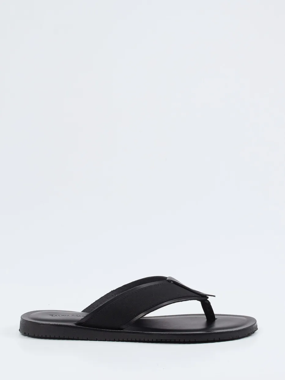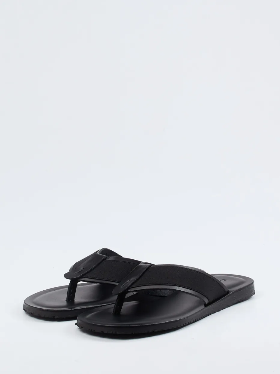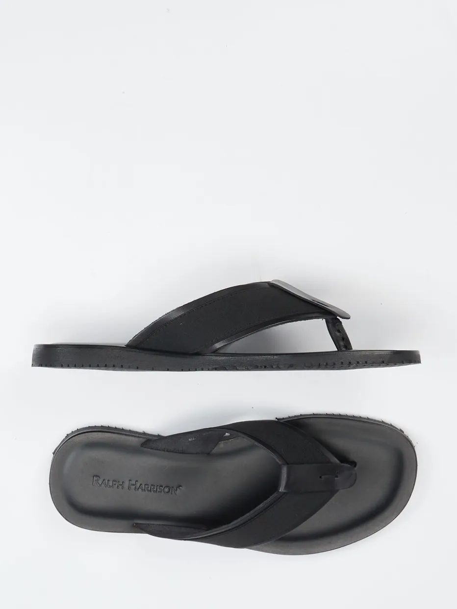 Sommerlicher Minimalismus auf Schritt und Tritt.Ralph Harrison präsentiert diese Herren-Zehentrenner-Pantolette aus edlem Kalbleder. Ideal für Freizeit und Urlaub, vereint sie schlichte Form mit funktionaler Raffinesse. Breite Riemen aus schwarzem Leder mit mattem Finish und tonaler Ripsband-Applikation sorgen für einen modernen Look. Die flache Gummisohle mit griffigem Chevron-Profil bietet dank weicher Polsterung optimalen Komfort. Das dezente Branding im Fußbett unterstreicht den cleanen Streetwear-Charakter. Passt perfekt zu Leinen-Bermudas oder monochromen Sommer-Outfits. Ein auf das Wesentliche reduziertes Design mit leisem Luxusanspruch – typisch Ralph Harrison.