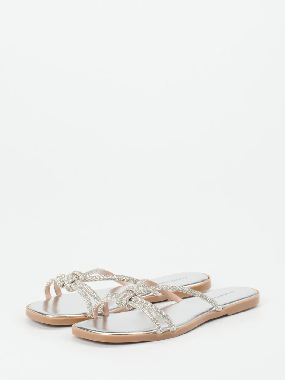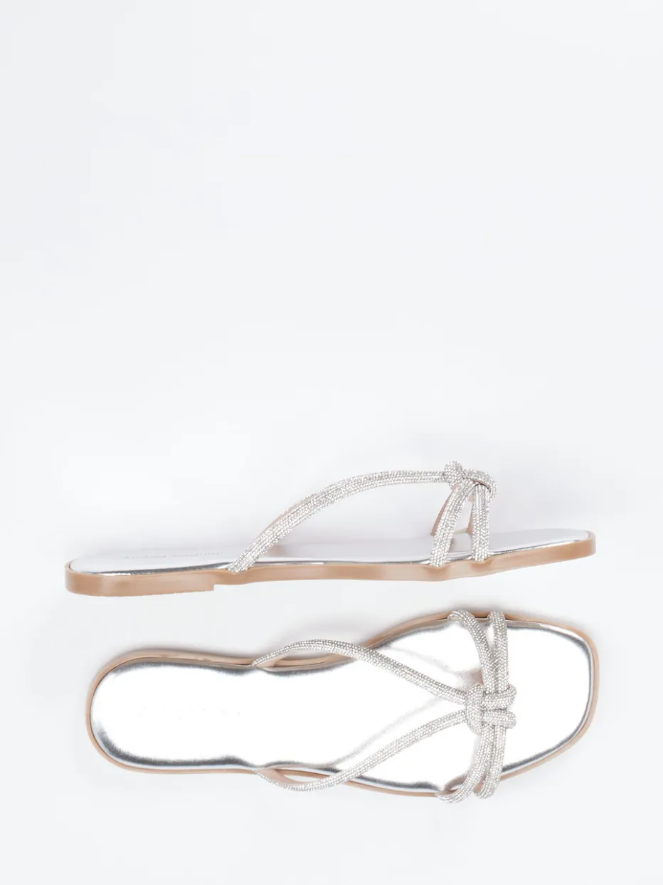 Strass und Metallic für besondere Sommermomente.Andrea Sabatini präsentiert eine Damen-Zehentrenner-Sandale, die Stilbewusstsein mit luftigem Komfort verbindet. Ob beim Stadtbummel im Sommerurlaub oder als schimmernder Akzent zum Abend-Look: Das glänzende Metallicleder in edlem Silber harmoniert mit dem aufwendig strassbesetzten Riemen. Die flache Form mit Carréleisten und die flexible Gummisohle sorgen für angenehmes Tragen. Ein Knoten-Detail und das schimmernde Fußbett unterstreichen die elegante Wirkung. Inspiriert vom Y2K-Revival passt das Modell ideal zu pastellfarbenen Kleidern oder einer Metallic-Clutch. Stilvolle Leichtigkeit mit einem Hauch Glamour – typisch Andrea Sabatini.