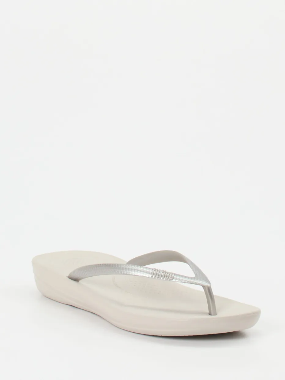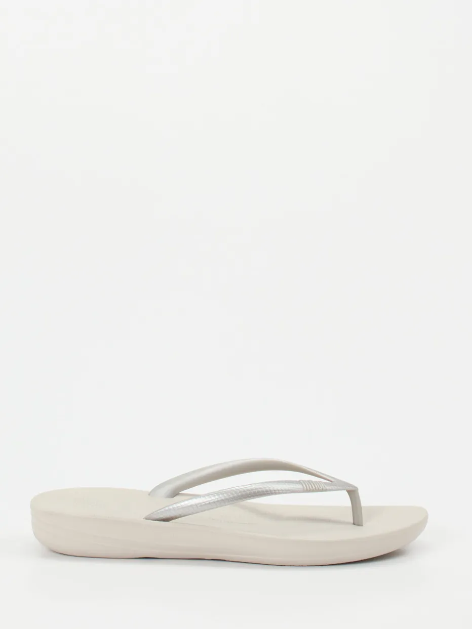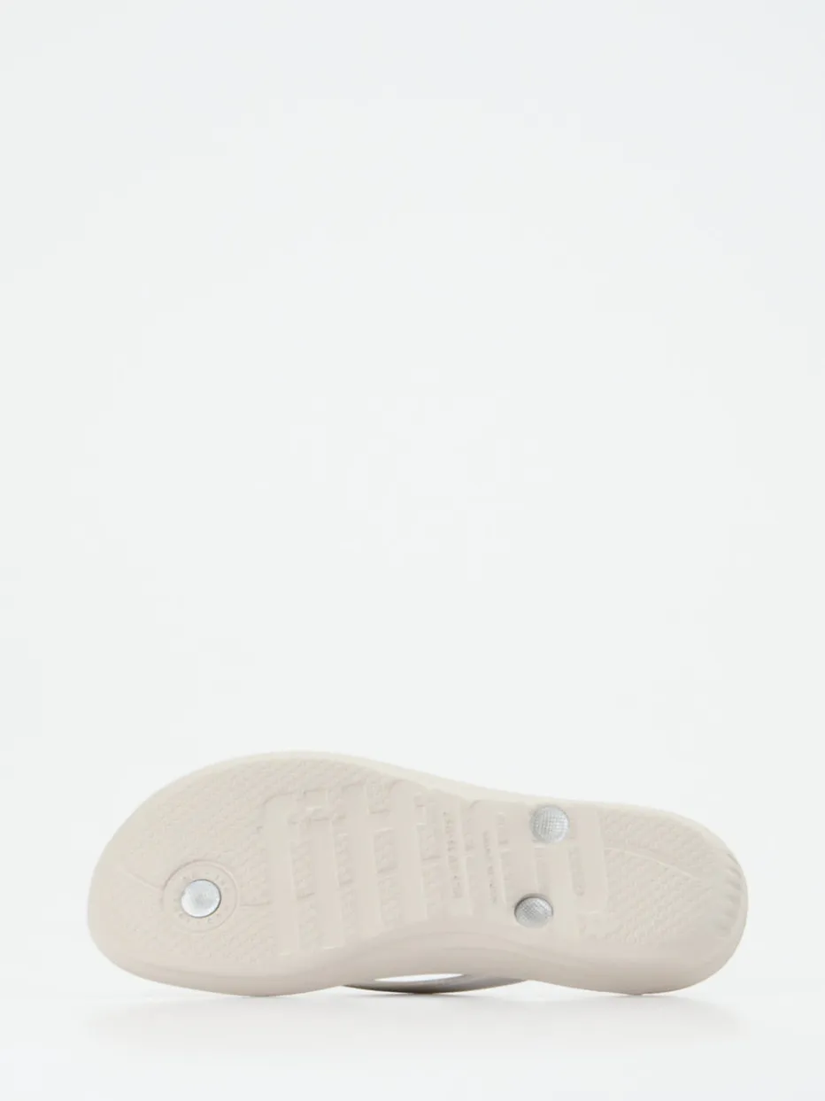 Minimalismus mit Funktion trifft Sommerfeeling.FitFlop präsentiert eine Damen-Zehentrenner-Sandale, die Stil und Bequemlichkeit perfekt ausbalanciert. Ideal für warme Tage in City oder am Meer: Das wasserabweisende Obermaterial aus Synthetik sorgt mit matt-silbernem Glanz für subtile Eleganz. Die flache Silhouette mit leichtem Keilabsatz und ergonomisch geformtem Fußbett stützt angenehm bei jedem Schritt. Der Schlupfeinstieg und die gepolsterte Innensohle betonen den auf Komfort ausgelegten, entspannten Charakter. Modisch im Quiet-Luxury-Trend verankert, passt sie zur Strandtasche wie zum Casual-Kaftan. FitFlop vereint Leichtigkeit mit ergonomischer Passform für stilbewusste Sommertage.