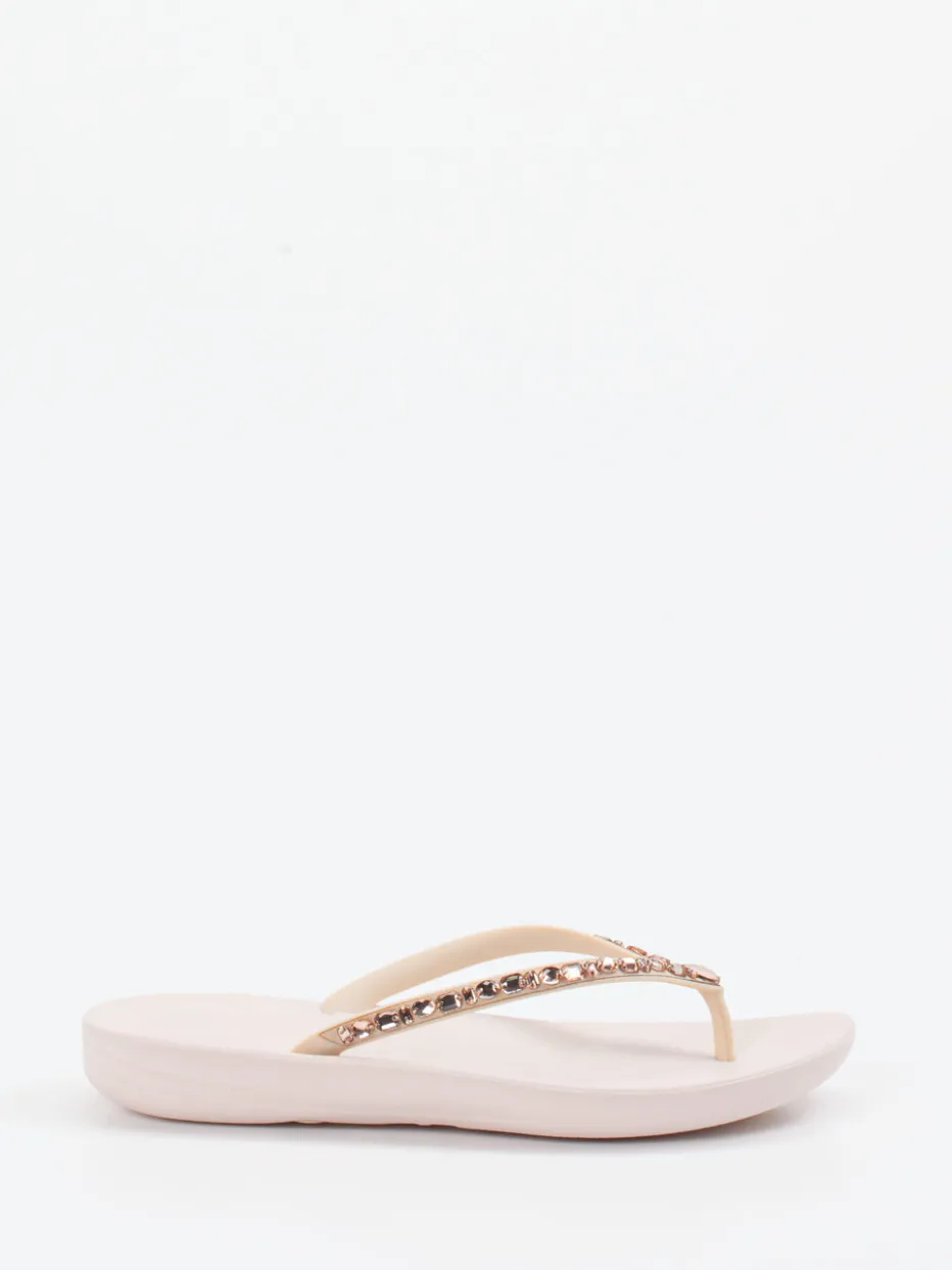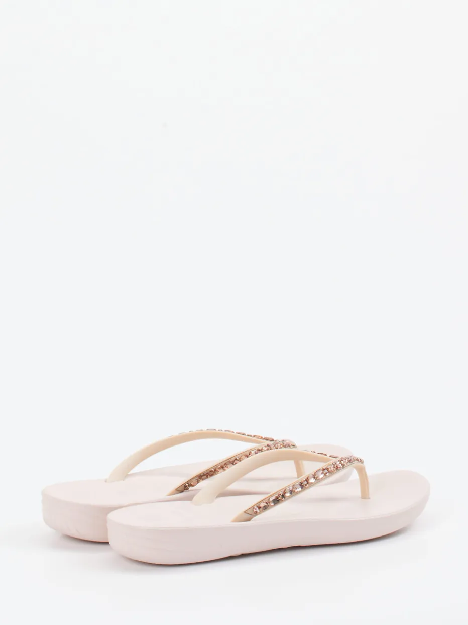 Ideal für entspannte Urlaubstage oder sommerlichen Alltag: Der leichte Zehentrenner aus hochwertigem Synthetikmaterial überzeugt durch seine ergonomisch geformte Sohle und das strukturierte Fußbett. Die cremeweiße Farbgebung unterstreicht den minimalistischen Look, während funkelnde Strassverzierungen in Roségold modische Highlights setzen. Dank fehlenden Verschlüssen bietet das Modell hohen Komfort und unkompliziertes Anziehen. Perfekt kombinierbar mit Resortwear und luftigen Sommerkleidern.