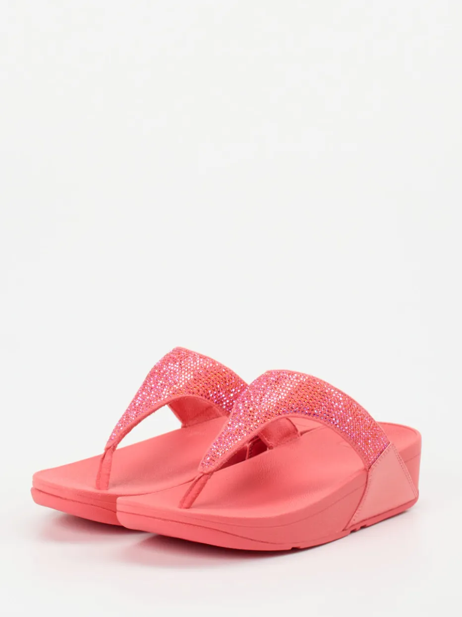 Funkelnder Komfort für sonnige Momente.FitFlop präsentiert mit diesem Zehentrenner ein komfortables Sommermodell für Damen. Ideal für entspannte Tage am Strand oder beim Stadtbummel: Das korallrosafarbene Textilobermaterial wirkt durch seinen feinen Glitzerbesatz besonders lebendig. Die keilförmige Sohle aus Gummi sorgt für ein angenehmes Laufgefühl – unterstützt von der ergonomisch geformten Fußbettung, die hohe Bequemlichkeit garantiert. Ganz ohne Verschluss gehalten, gleitet der Schuh mühelos über den Fuß. Stilistisch vereint das Modell Elemente der Y2K-Ästhetik mit aktuellen Colortouch-Trends. FitFlop kombiniert modische Ausstrahlung mit funktionalem Tragegefühl.