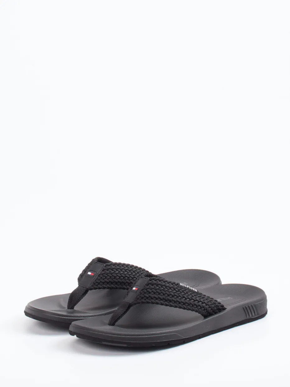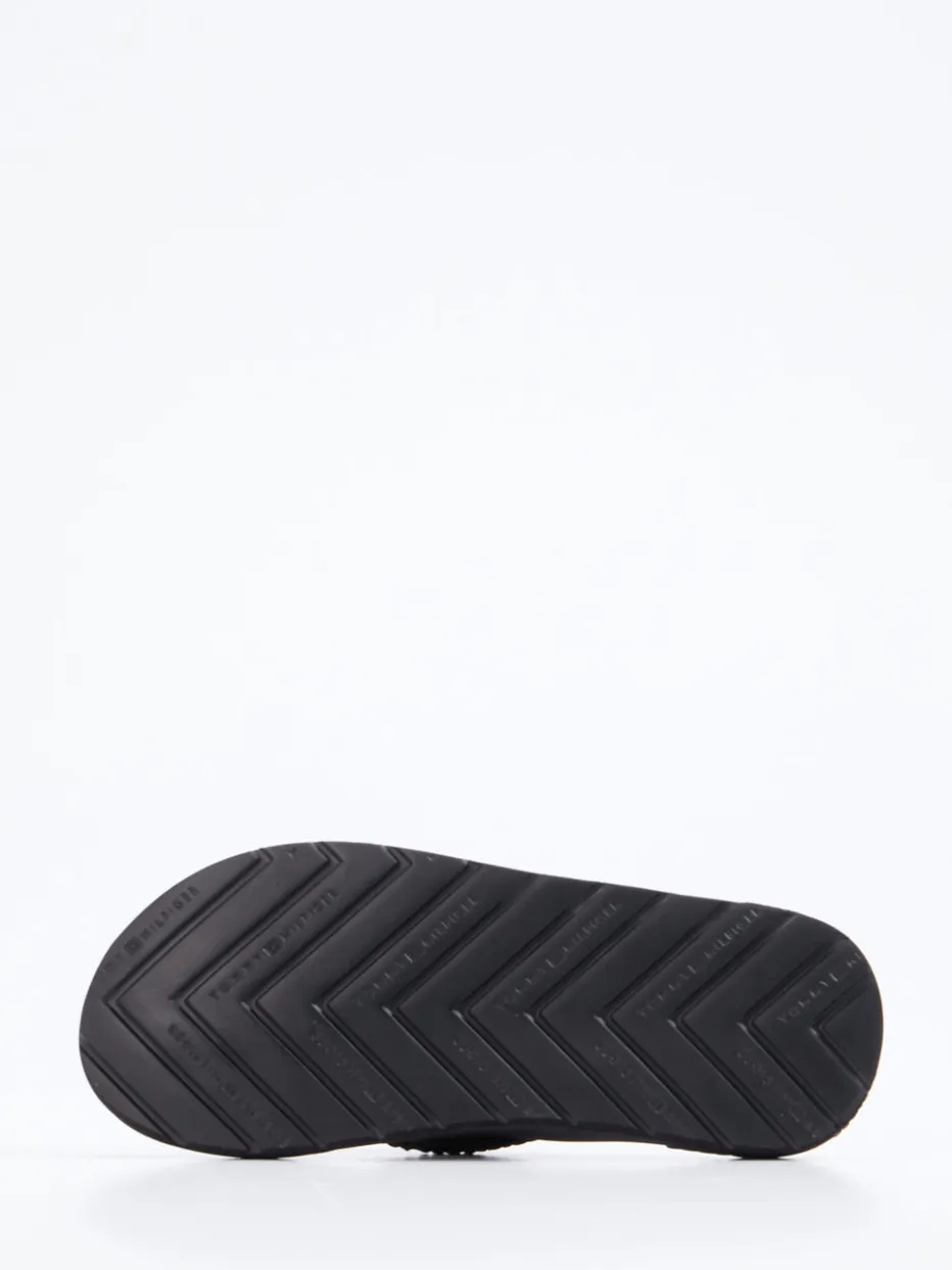 Minimalistische Leichtigkeit für warme Tage.Tommy Hilfiger präsentiert mit dieser Herren-Zehentrenner-Sandale ein funktionales Modell mit urbanem Charme. Ideal für entspannte Sommertage am Strand oder in der Stadt: Die Sandale aus schwarzem Textil zeigt sich mit gewebtem, matt strukturiertem Riemen, dezenten Logos und einem ergonomisch geformten EVA-Fußbett. Die flache Silhouette und eine griffig profilierte Synthetiksohle vermitteln trittsicheren Komfort bei sommerlich leichtem Gewicht. Ihr minimalistisches Design spiegelt den Quiet-Luxury-Trend wider – perfekt für entspannte Casual-Looks. Ein komfortbewusstes Sommer-Essential mit markentypischem Understatement.