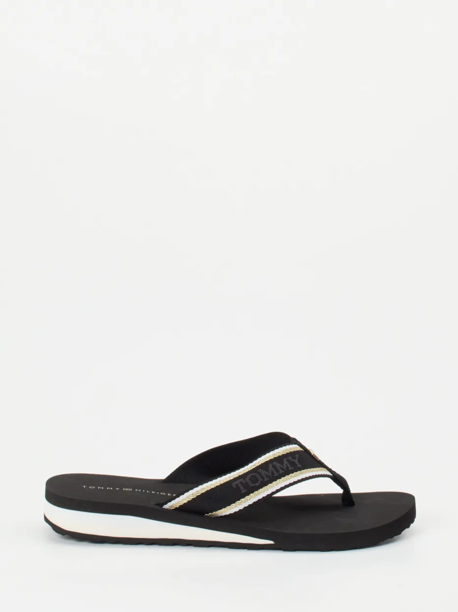 Sommer-Essential mit markantem Logo-Akzent.Tommy Hilfiger interpretiert den Klassiker der Badepantolette neu. Die Damen-Zehentrenner kombinieren schwarzes Textil mit matter Oberfläche und einem soften Innenleben für optimalen Tragekomfort. Goldgelbe und weiße Akzente am Riemen setzen Markenlogos stilvoll in Szene. Die klassische, flache Silhouette erhält durch die leicht keilförmige EVA-Sohle einen modernen Plateau-Effekt. Ideal für Strandtage, Poolbesuche oder entspannte Sommermomente in der Stadt. Lässt sich vielseitig zu Leinenkleid oder Shorts im Streetwear-Stil kombinieren. Verbindet Stilbewusstsein mit funktionalem Komfort – typisch Tommy Hilfiger.