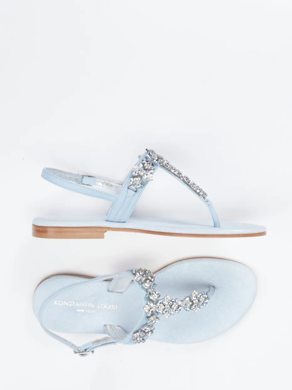 Glanzvoll inszeniert für sommerliche Eleganz.Die Damen-Sandale von Konstantin Starke vereint feines Design mit femininer Raffinesse. Für besondere Anlässe an warmen Tagen konzipiert, überzeugt das Modell mit edlem Metallicleder in blassem Blau, geschmeidigem Kalblederfutter und einer flexiblen Ledersohle. Die flache, offene Form harmoniert mit einem verstellbaren Fersenriemen und einer Dornschließe für optimalen Sitz. Der Kristallbesatz mit weißen und hellblauen Steinen bildet stilisierte Blütenmotive und wird durch silberfarbene Zierelemente ergänzt. Inspiriert vom Stil der 90er Jahre, trifft der Look den Trend „Quiet Luxury“ perfekt. Kombinierbar mit einem Sommerkleid oder einer silberfarbenen Clutch. Dezenter Luxus mit handwerklicher Leichtigkeit von Konstantin Starke.