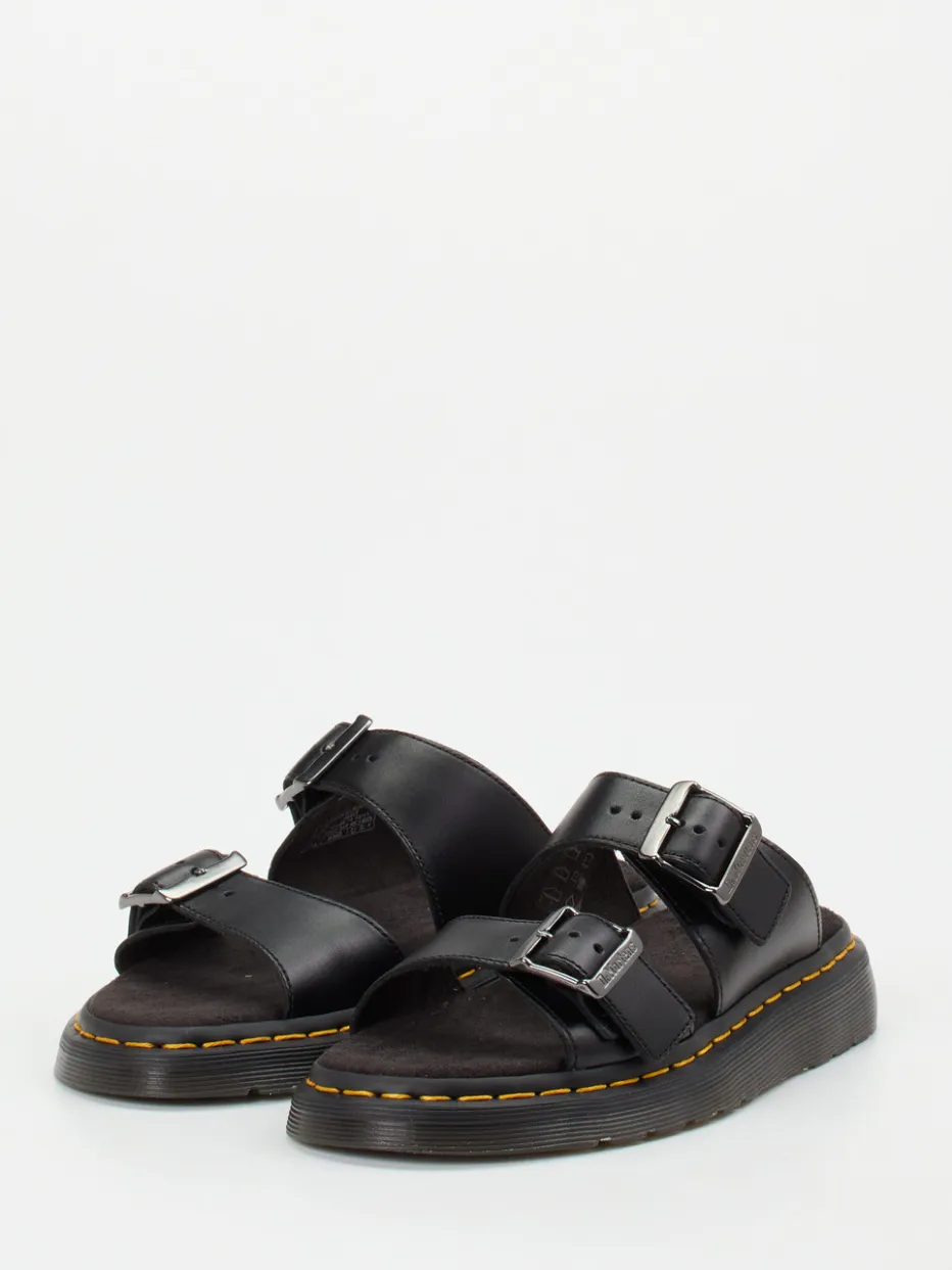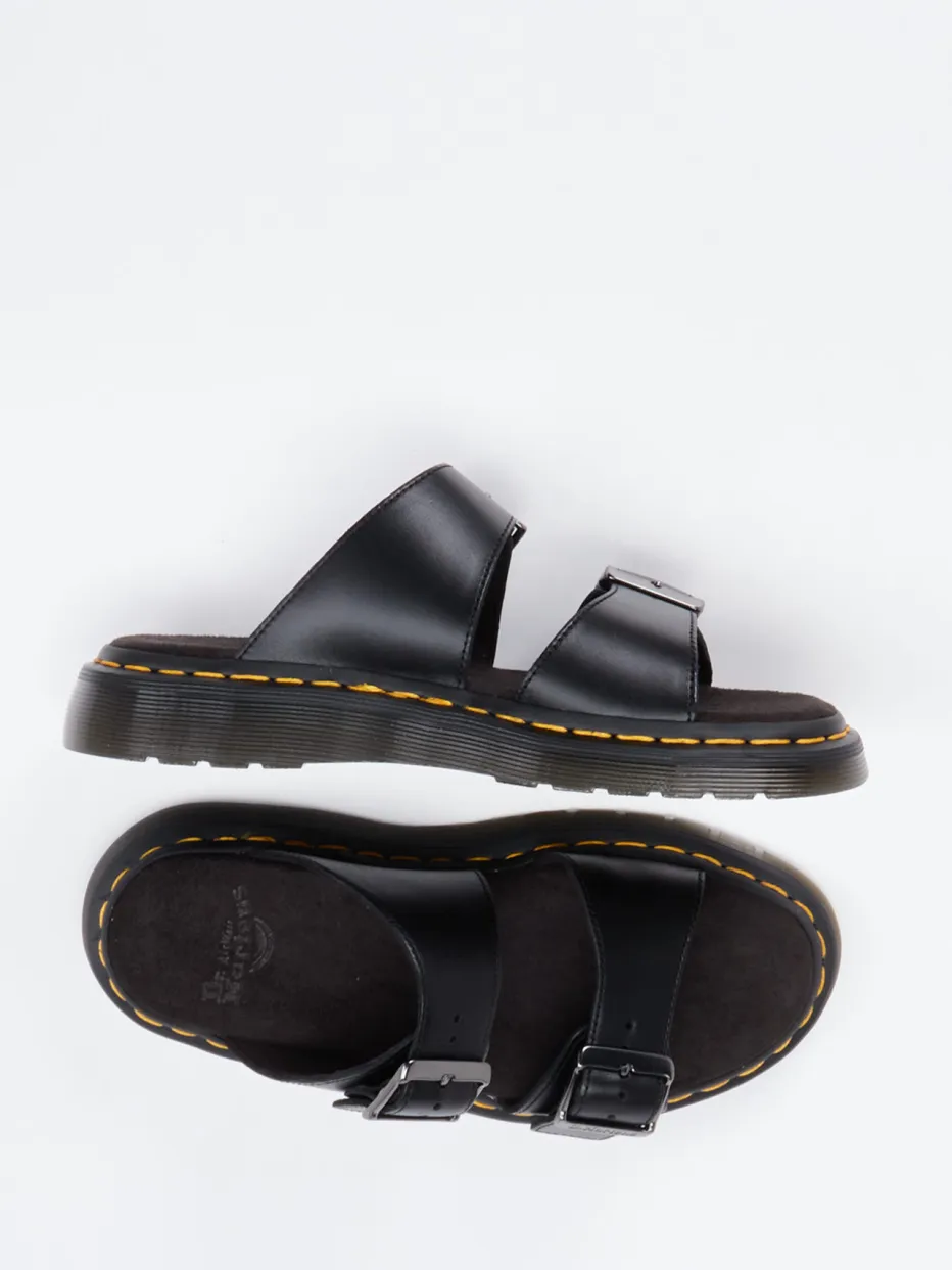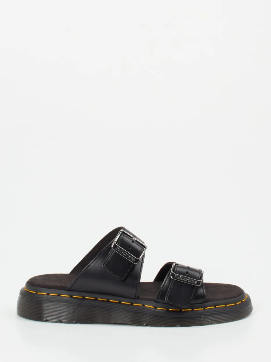 Unverkennbarer Sommer-Look mit Profil.Dr. Martens präsentiert eine moderne Zweiriemer-Sandale aus hochwertigem Kalbleder. Ideal für wärmere Tage in der Stadt oder auf Reisen: Zwei verstellbare Riemen aus geschmeidigem Glattleder garantieren eine individuelle Passform. Das matt strukturierte Obermaterial in Schwarz trifft auf ein weiches, gepolstertes Fußbett aus Veloursleder. Besonders ins Auge fällt die charakteristische Profilsohle mit gelber Kontrastnaht – ergonomisch geformt und rutschhemmend. Inspiriert vom Chunky-Trend und Gorpcore-Stil bringt das Modell urbanen Komfort in den Alltag. Lässt sich vielseitig mit Shorts und Oversize-Tops kombinieren. Markentypischer Stil mit hoher Alltagstauglichkeit – funktional und ausdrucksstark zugleich.